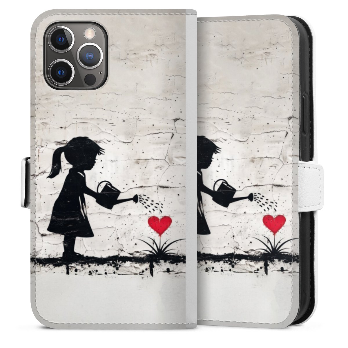 For our Sideflip Case we are using our advanced direct printing technology. The back and frontside are fully printabale, the inside of the phone bag is left unprinted. You can order the phone case without print, printed completely or also with a partial print.