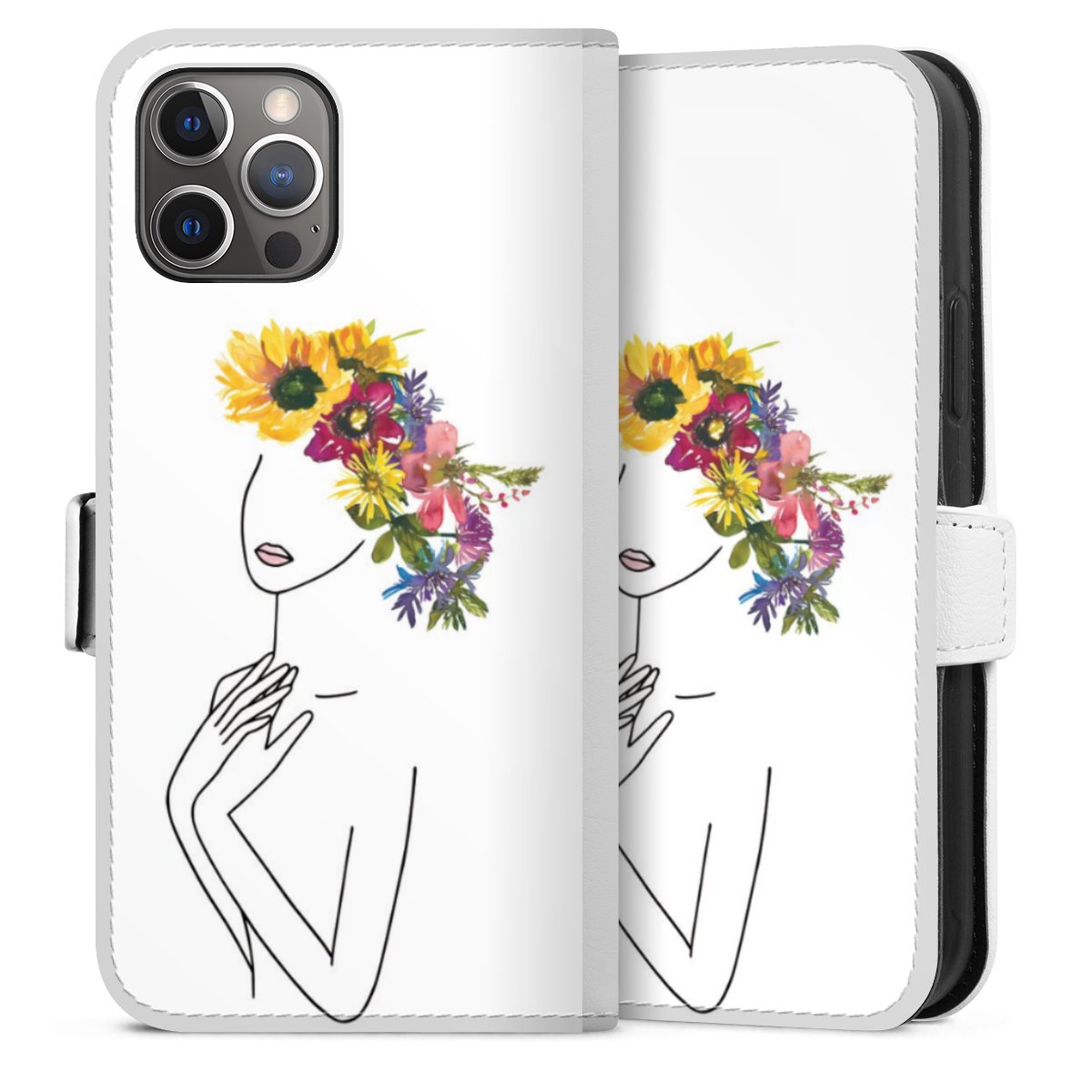 For our Sideflip Case we are using our advanced direct printing technology. The back and frontside are fully printabale, the inside of the phone bag is left unprinted. You can order the phone case without print, printed completely or also with a partial print.