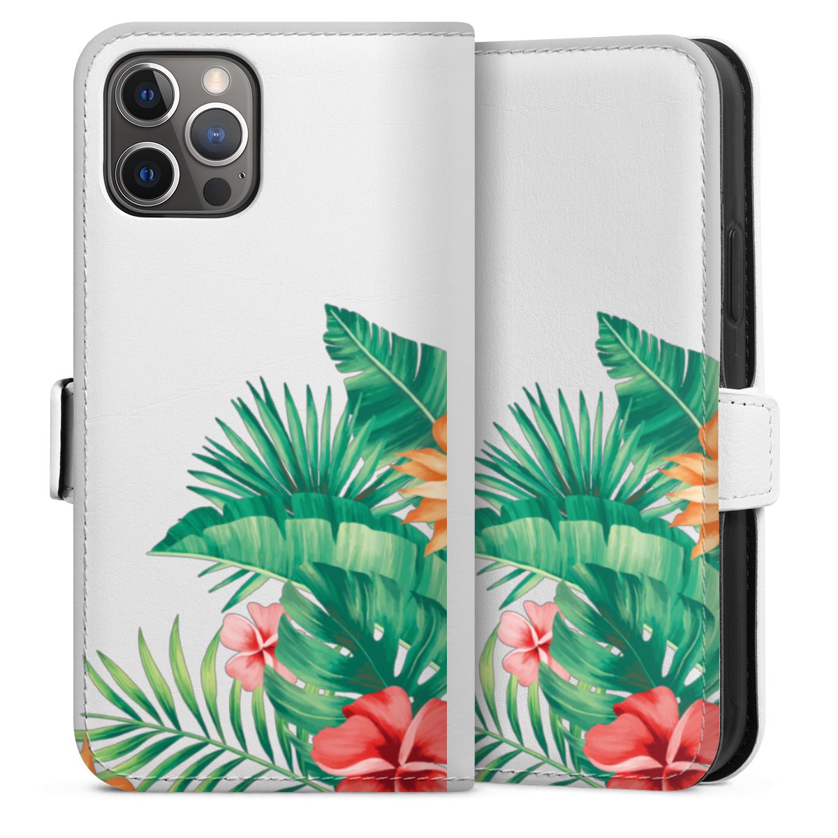 For our Sideflip Case we are using our advanced direct printing technology. The back and frontside are fully printabale, the inside of the phone bag is left unprinted. You can order the phone case without print, printed completely or also with a partial print.