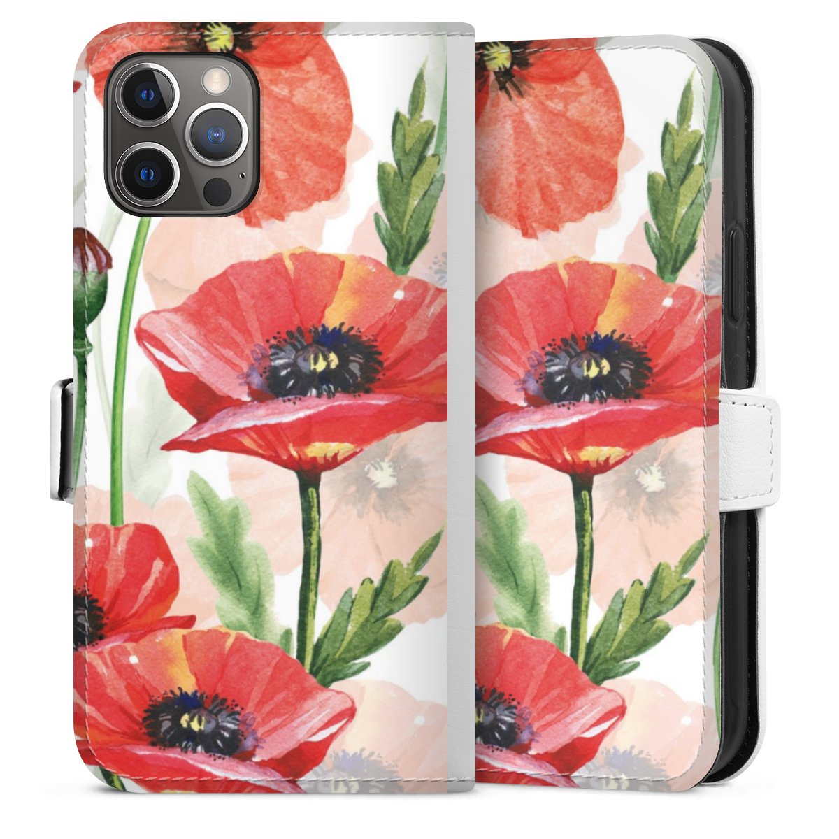 For our Sideflip Case we are using our advanced direct printing technology. The back and frontside are fully printabale, the inside of the phone bag is left unprinted. You can order the phone case without print, printed completely or also with a partial print.