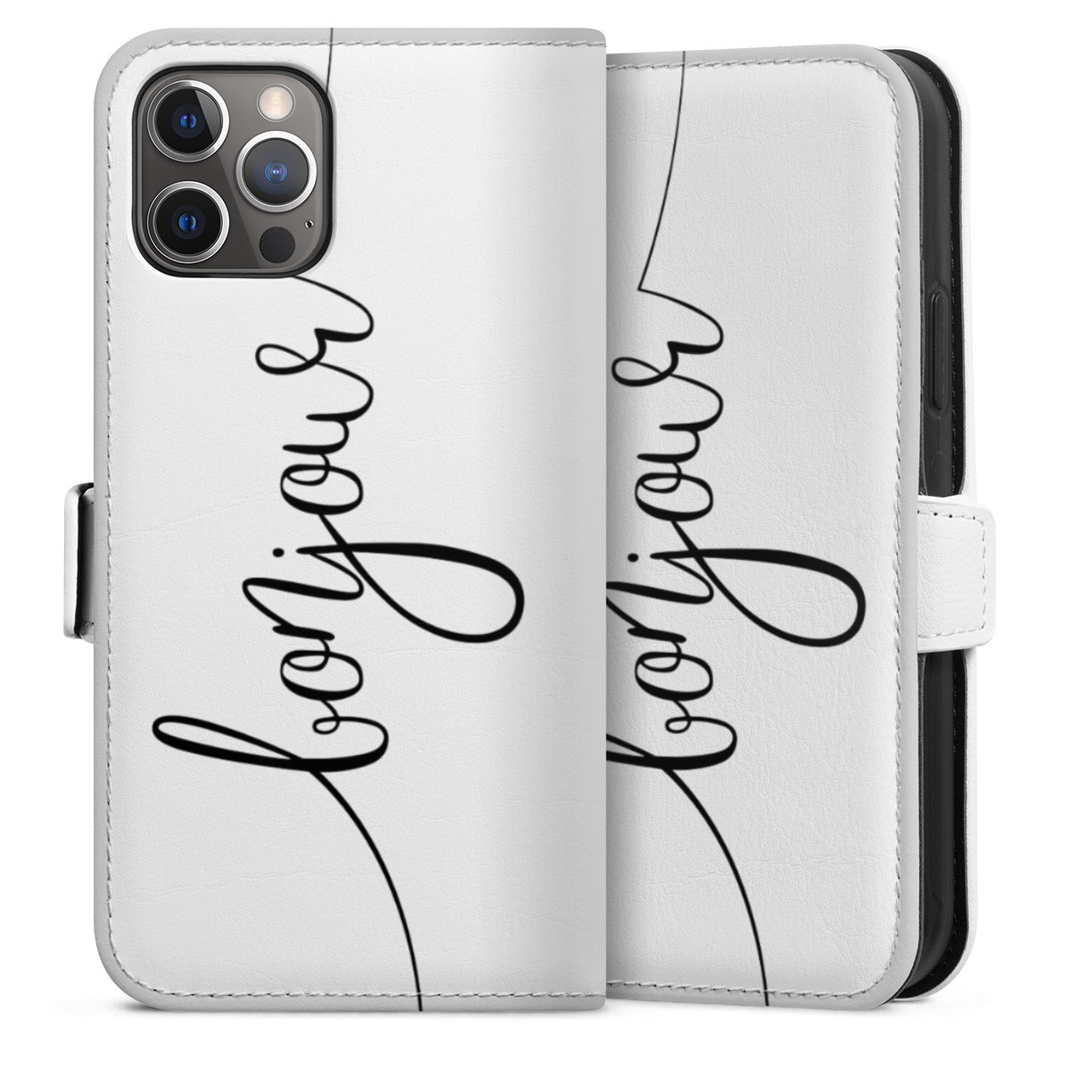For our Sideflip Case we are using our advanced direct printing technology. The back and frontside are fully printabale, the inside of the phone bag is left unprinted. You can order the phone case without print, printed completely or also with a partial print.