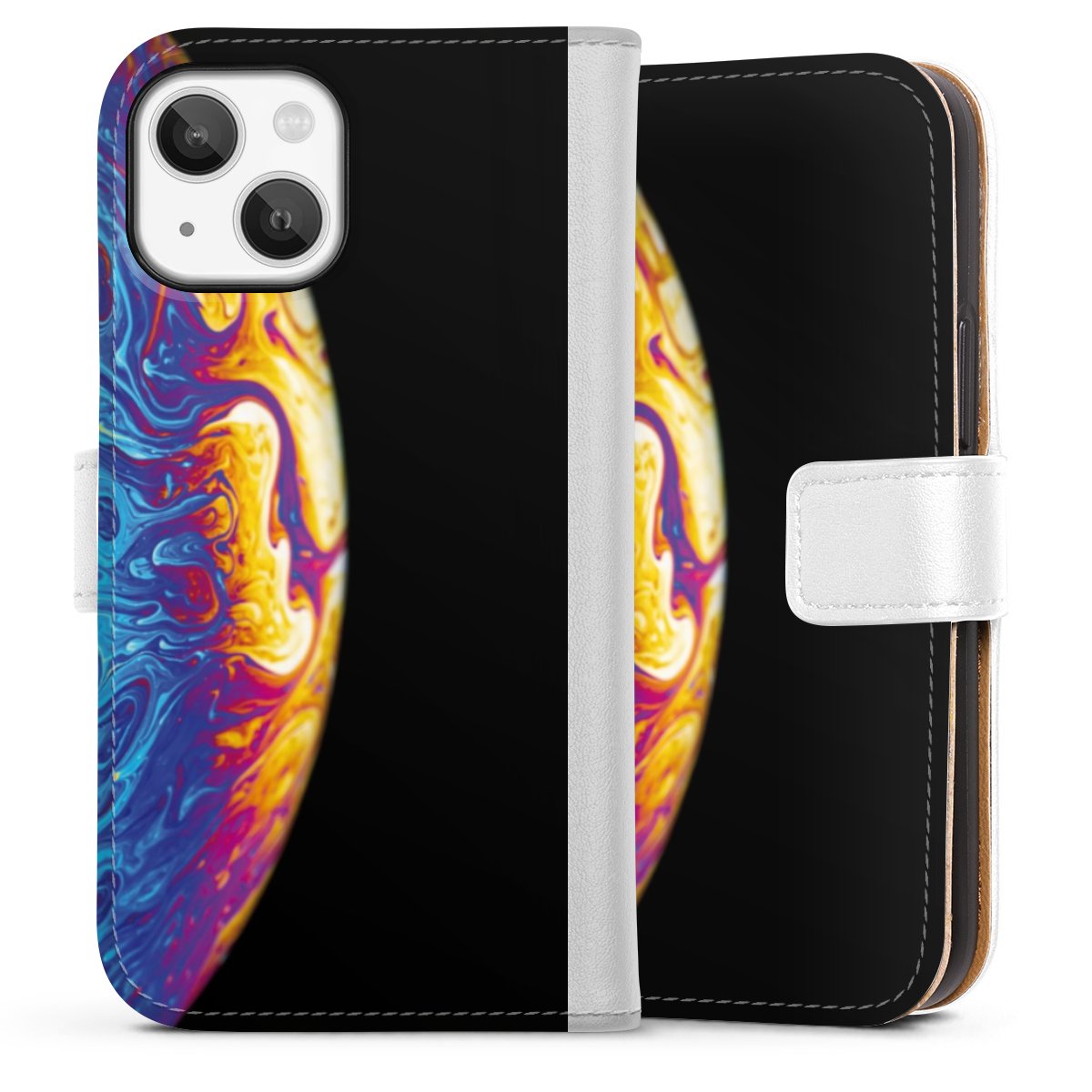 For our Sideflip Case we are using our advanced direct printing technology. The back and frontside are fully printabale, the inside of the phone bag is left unprinted. You can order the phone case without print, printed completely or also with a partial print.