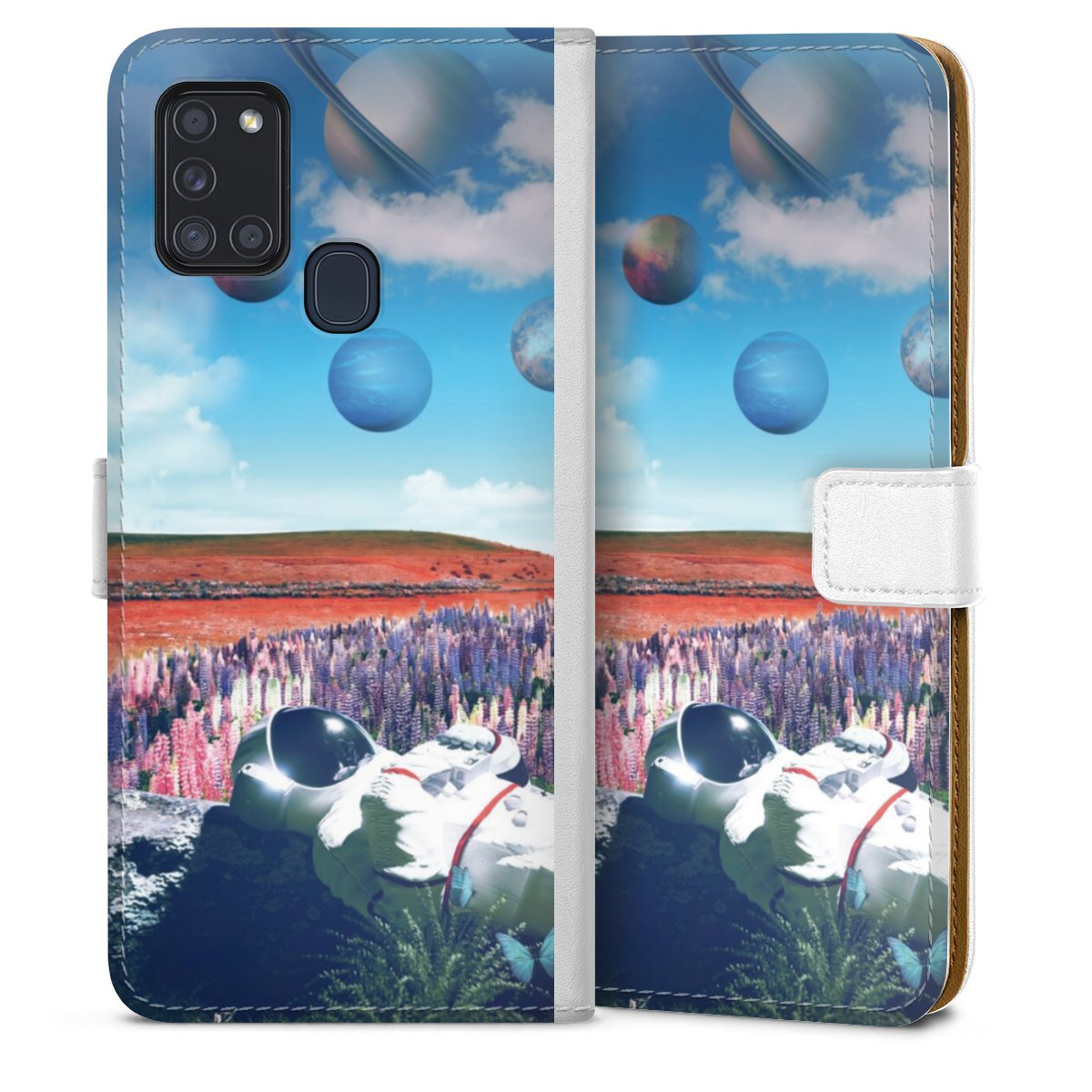 For our Sideflip Case we are using our advanced direct printing technology. The back and frontside are fully printabale, the inside of the phone bag is left unprinted. You can order the phone case without print, printed completely or also with a partial print.