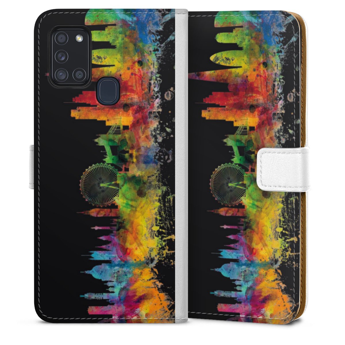 For our Sideflip Case we are using our advanced direct printing technology. The back and frontside are fully printabale, the inside of the phone bag is left unprinted. You can order the phone case without print, printed completely or also with a partial print.
