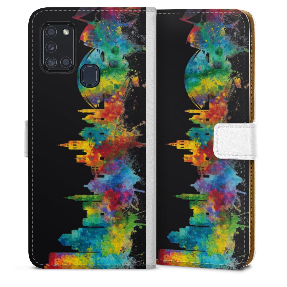 For our Sideflip Case we are using our advanced direct printing technology. The back and frontside are fully printabale, the inside of the phone bag is left unprinted. You can order the phone case without print, printed completely or also with a partial print.