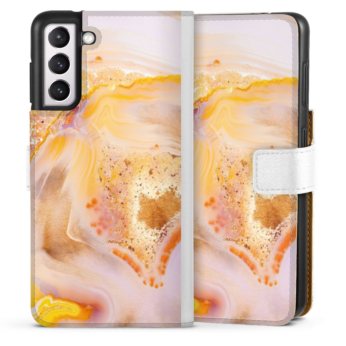 For our Sideflip Case we are using our advanced direct printing technology. The back and frontside are fully printabale, the inside of the phone bag is left unprinted. You can order the phone case without print, printed completely or also with a partial print.