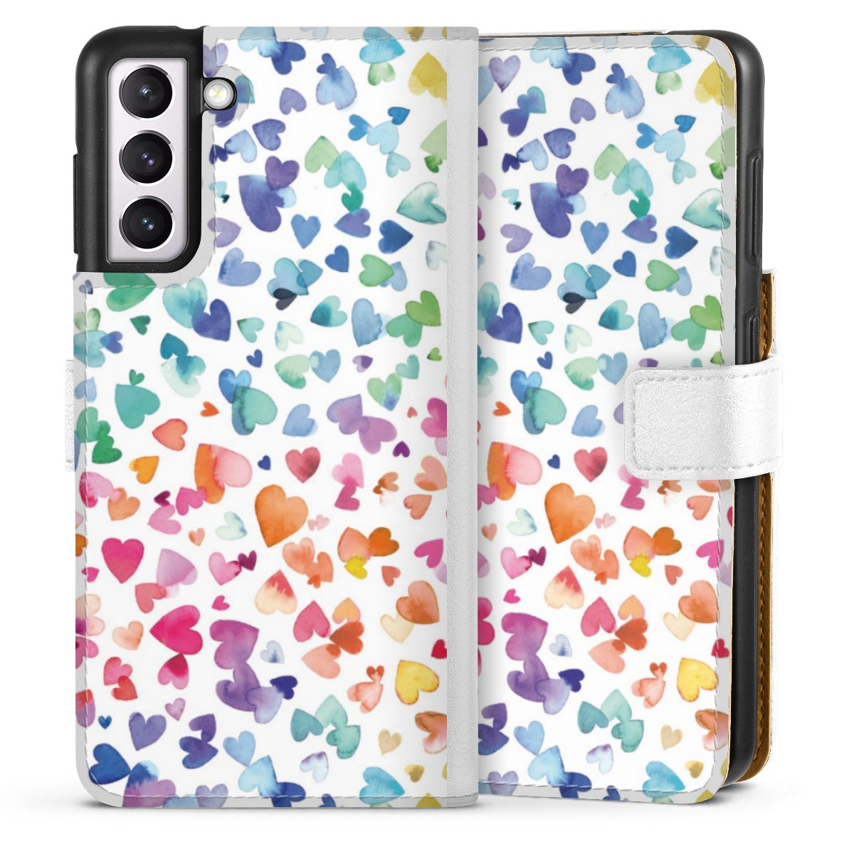 For our Sideflip Case we are using our advanced direct printing technology. The back and frontside are fully printabale, the inside of the phone bag is left unprinted. You can order the phone case without print, printed completely or also with a partial print.