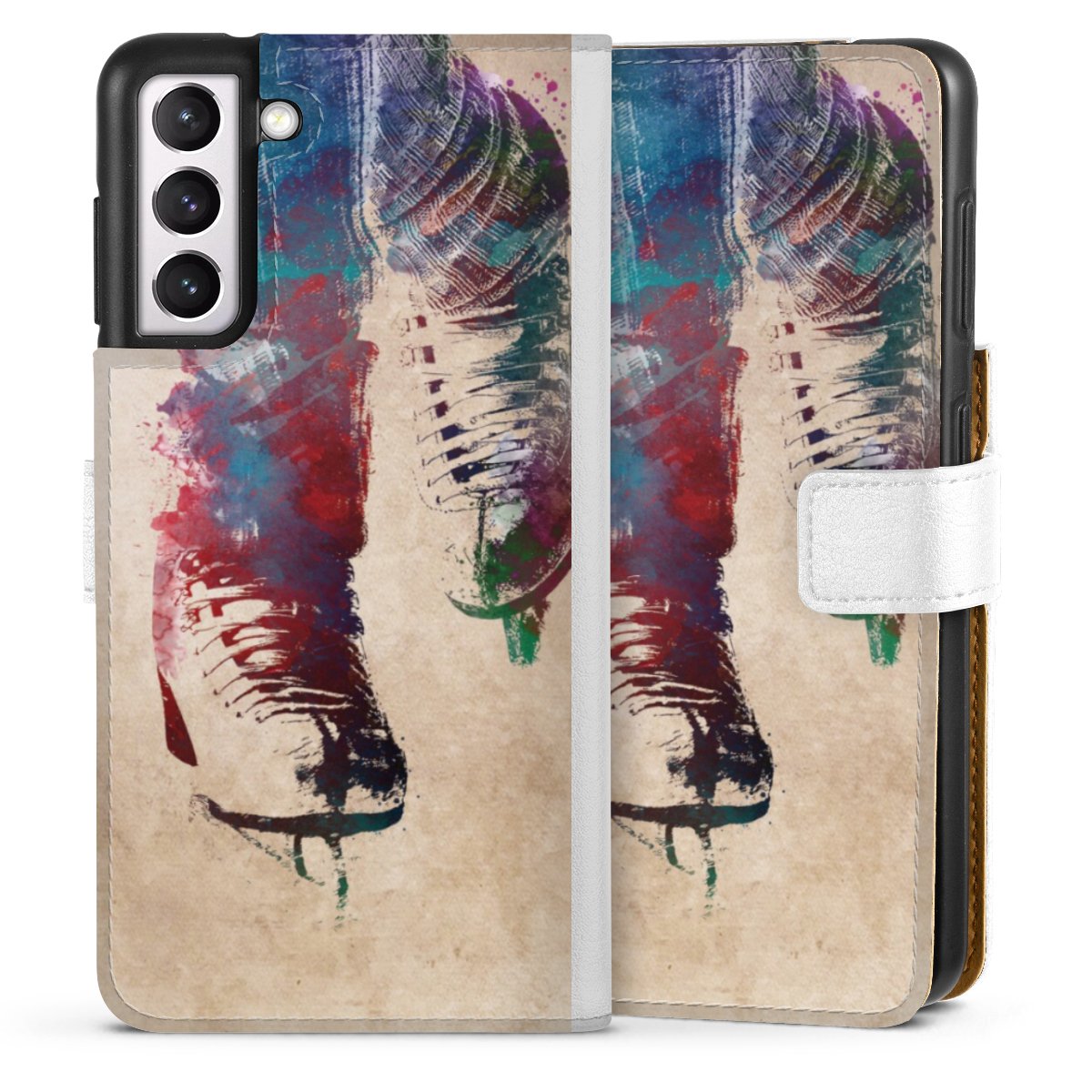 For our Sideflip Case we are using our advanced direct printing technology. The back and frontside are fully printabale, the inside of the phone bag is left unprinted. You can order the phone case without print, printed completely or also with a partial print.