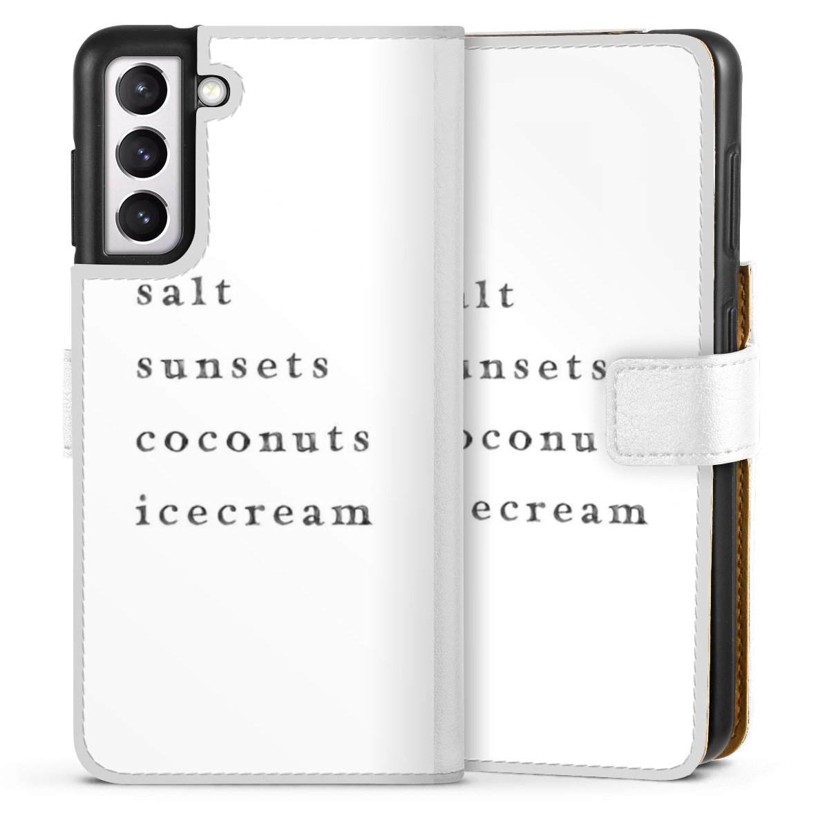 For our Sideflip Case we are using our advanced direct printing technology. The back and frontside are fully printabale, the inside of the phone bag is left unprinted. You can order the phone case without print, printed completely or also with a partial print.