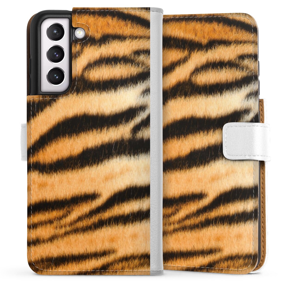 For our Sideflip Case we are using our advanced direct printing technology. The back and frontside are fully printabale, the inside of the phone bag is left unprinted. You can order the phone case without print, printed completely or also with a partial print.