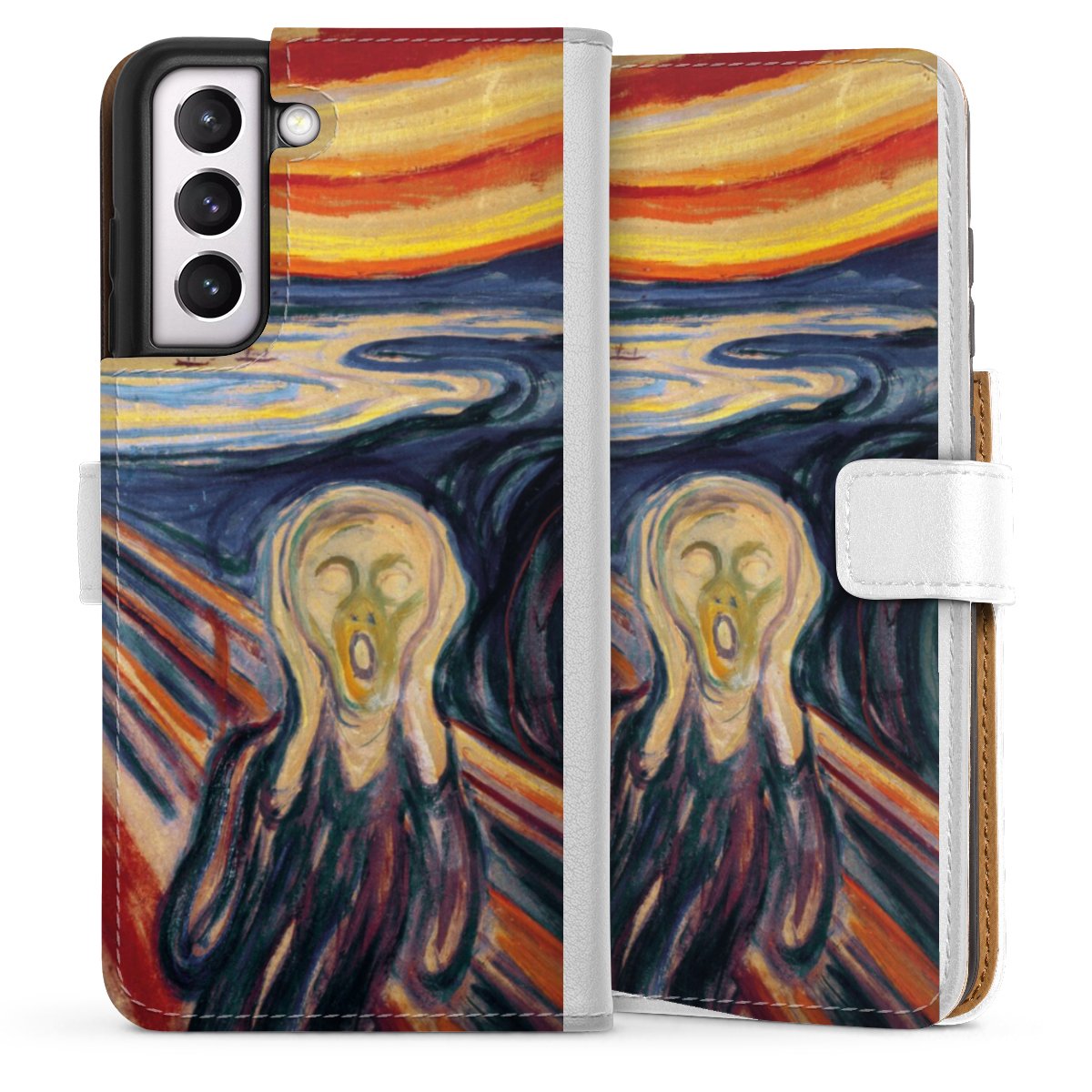 For our Sideflip Case we are using our advanced direct printing technology. The back and frontside are fully printabale, the inside of the phone bag is left unprinted. You can order the phone case without print, printed completely or also with a partial print.