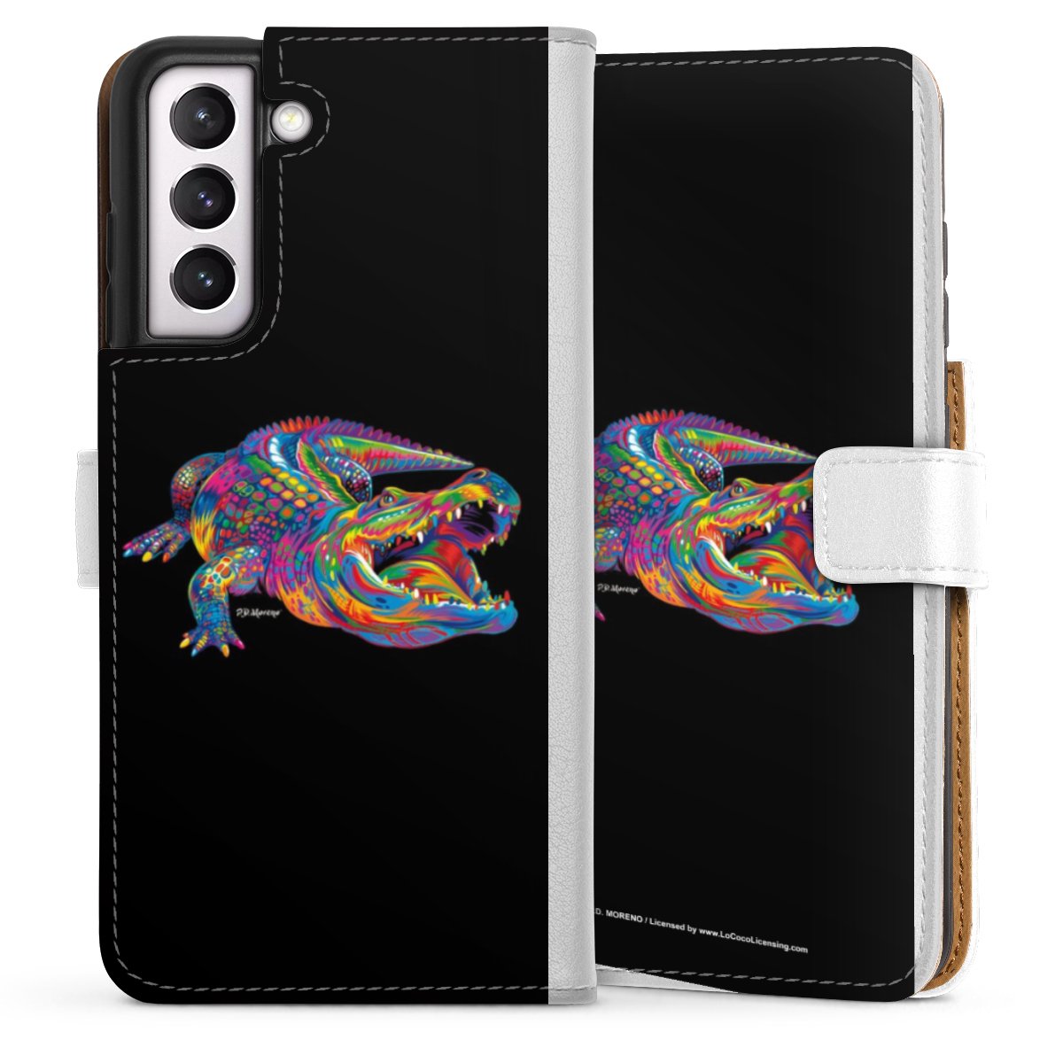 For our Sideflip Case we are using our advanced direct printing technology. The back and frontside are fully printabale, the inside of the phone bag is left unprinted. You can order the phone case without print, printed completely or also with a partial print.