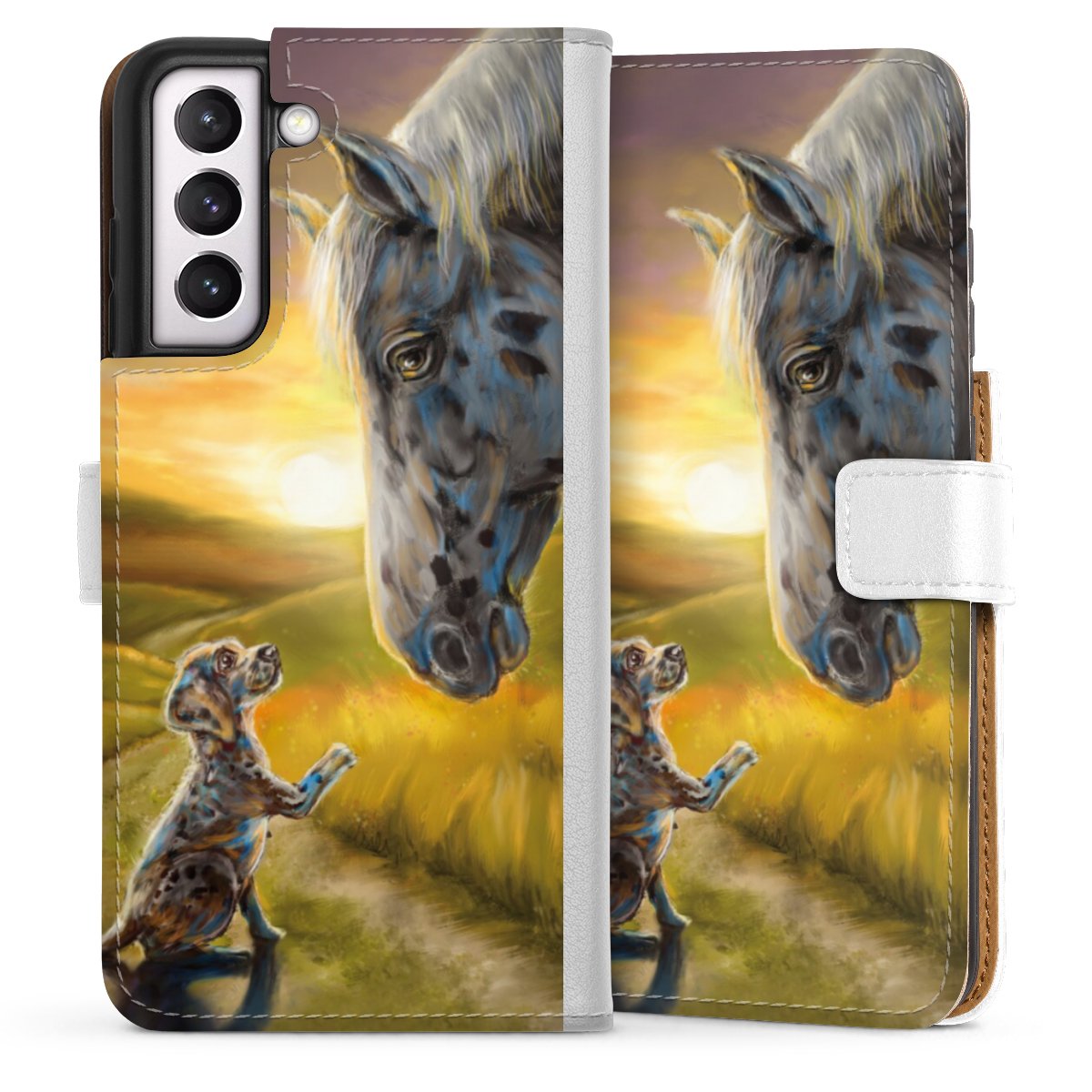 For our Sideflip Case we are using our advanced direct printing technology. The back and frontside are fully printabale, the inside of the phone bag is left unprinted. You can order the phone case without print, printed completely or also with a partial print.