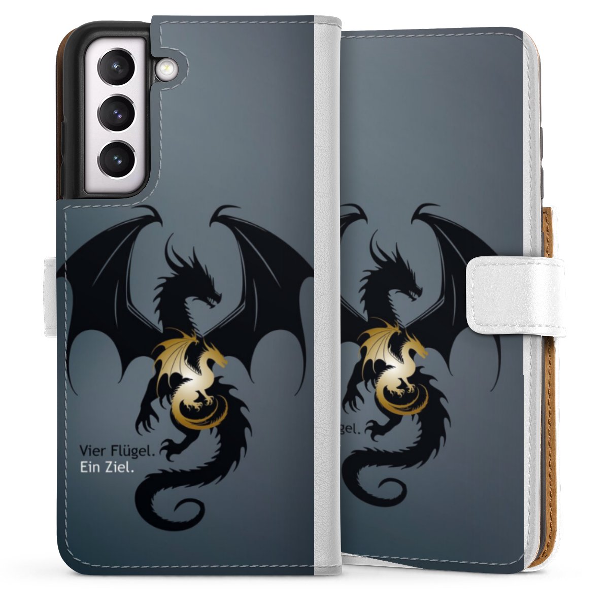 For our Sideflip Case we are using our advanced direct printing technology. The back and frontside are fully printabale, the inside of the phone bag is left unprinted. You can order the phone case without print, printed completely or also with a partial print.