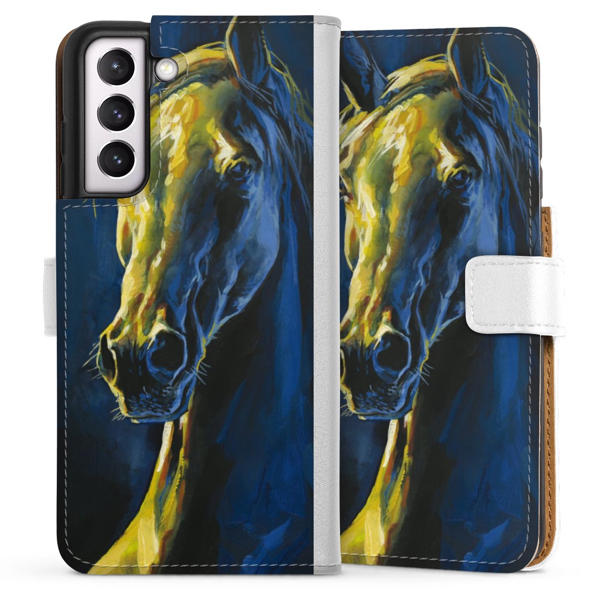 For our Sideflip Case we are using our advanced direct printing technology. The back and frontside are fully printabale, the inside of the phone bag is left unprinted. You can order the phone case without print, printed completely or also with a partial print.
