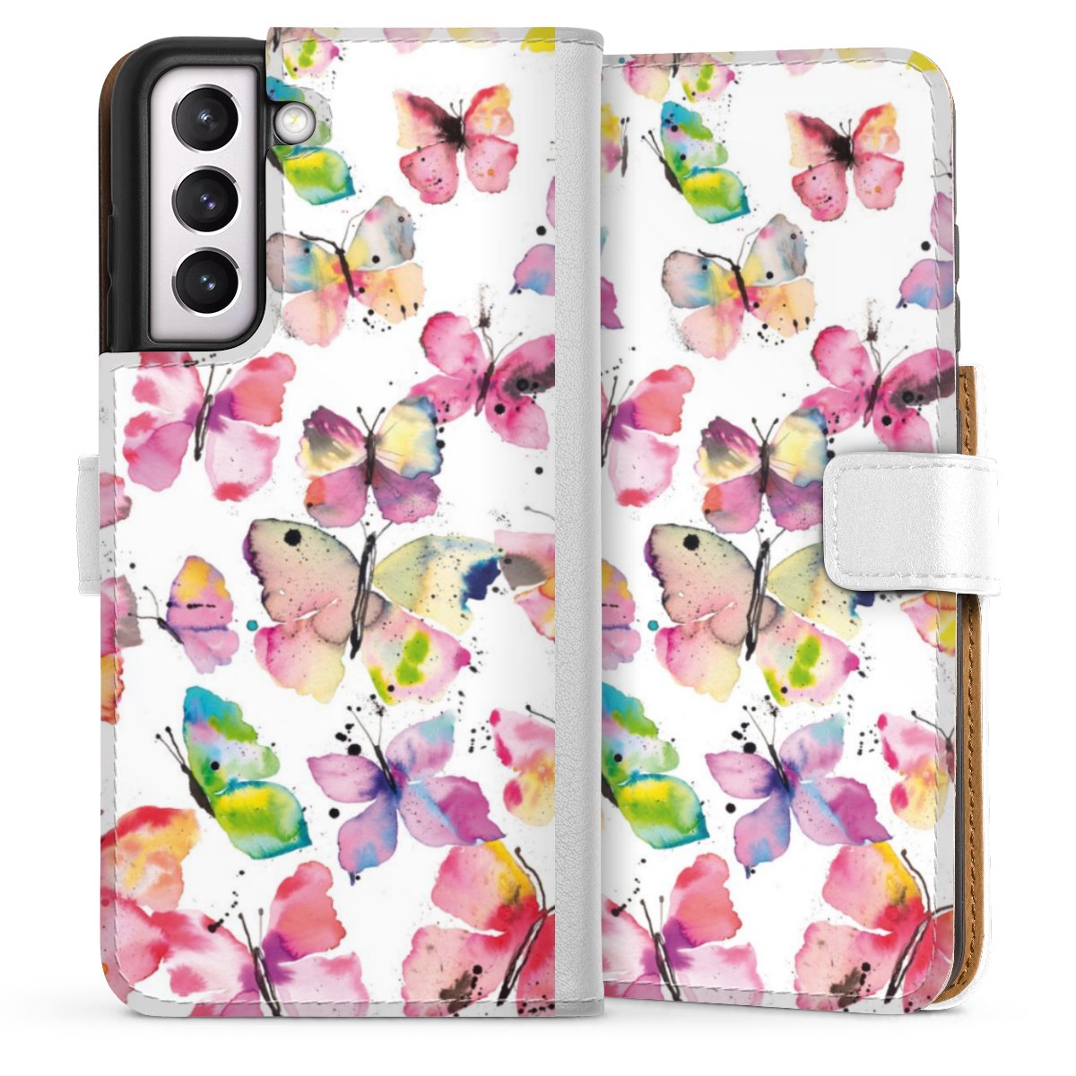 For our Sideflip Case we are using our advanced direct printing technology. The back and frontside are fully printabale, the inside of the phone bag is left unprinted. You can order the phone case without print, printed completely or also with a partial print.