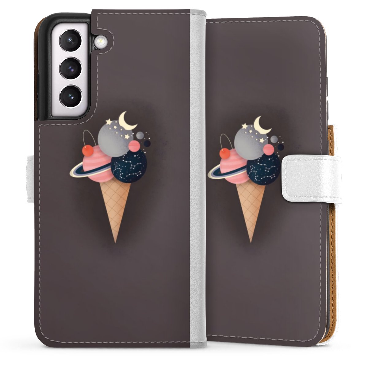 For our Sideflip Case we are using our advanced direct printing technology. The back and frontside are fully printabale, the inside of the phone bag is left unprinted. You can order the phone case without print, printed completely or also with a partial print.