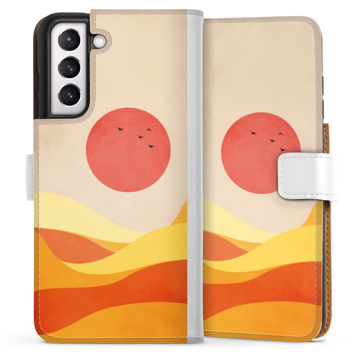 For our Sideflip Case we are using our advanced direct printing technology. The back and frontside are fully printabale, the inside of the phone bag is left unprinted. You can order the phone case without print, printed completely or also with a partial print.