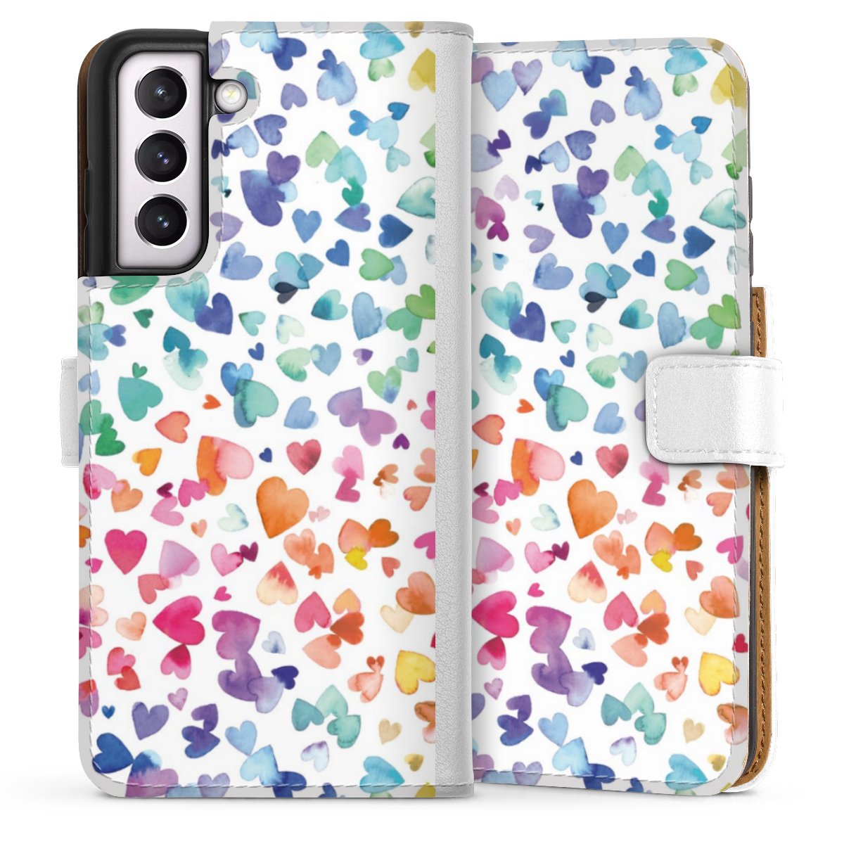 For our Sideflip Case we are using our advanced direct printing technology. The back and frontside are fully printabale, the inside of the phone bag is left unprinted. You can order the phone case without print, printed completely or also with a partial print.