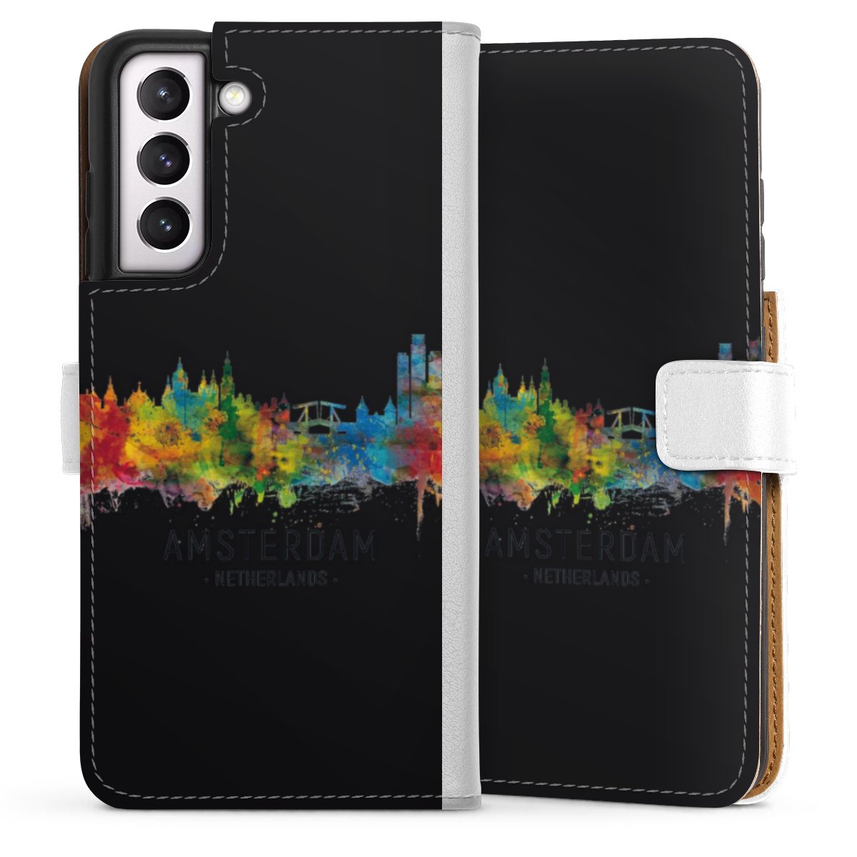 For our Sideflip Case we are using our advanced direct printing technology. The back and frontside are fully printabale, the inside of the phone bag is left unprinted. You can order the phone case without print, printed completely or also with a partial print.