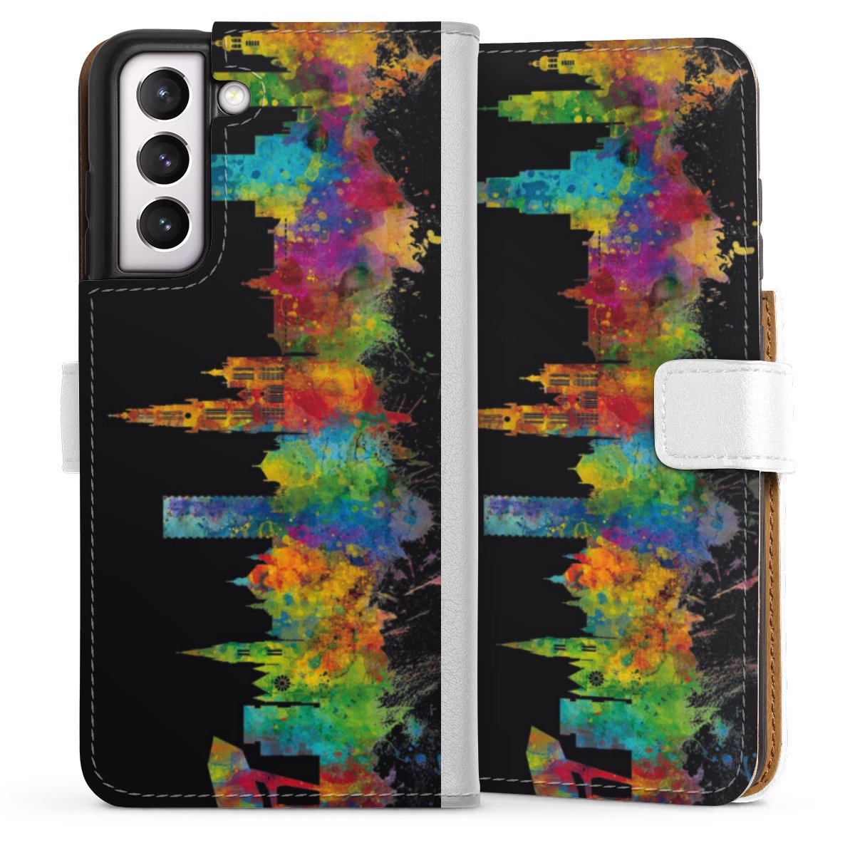 For our Sideflip Case we are using our advanced direct printing technology. The back and frontside are fully printabale, the inside of the phone bag is left unprinted. You can order the phone case without print, printed completely or also with a partial print.