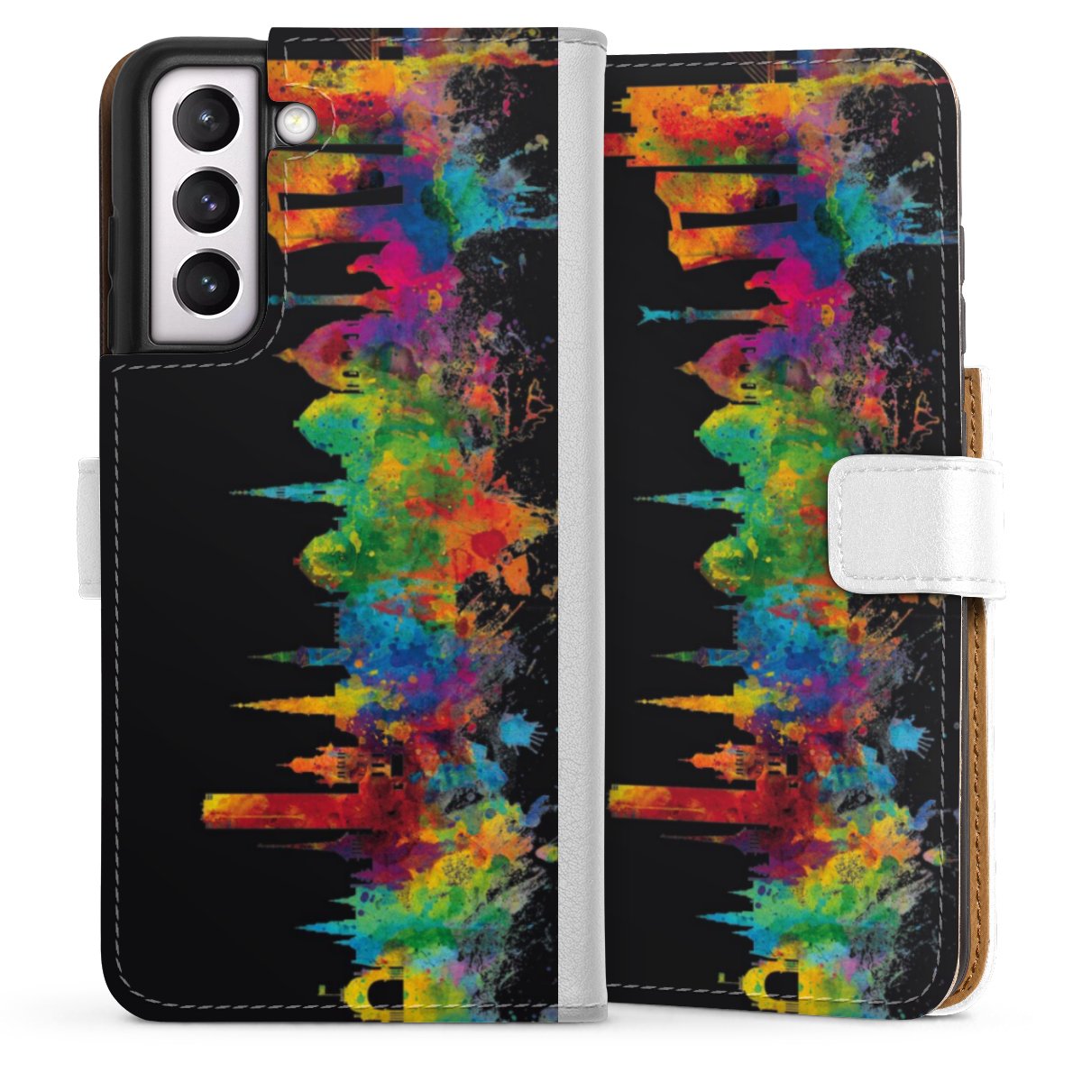 For our Sideflip Case we are using our advanced direct printing technology. The back and frontside are fully printabale, the inside of the phone bag is left unprinted. You can order the phone case without print, printed completely or also with a partial print.