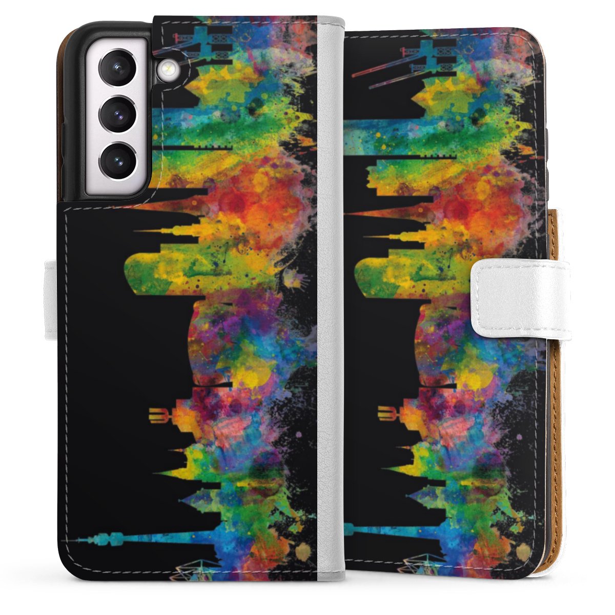 For our Sideflip Case we are using our advanced direct printing technology. The back and frontside are fully printabale, the inside of the phone bag is left unprinted. You can order the phone case without print, printed completely or also with a partial print.