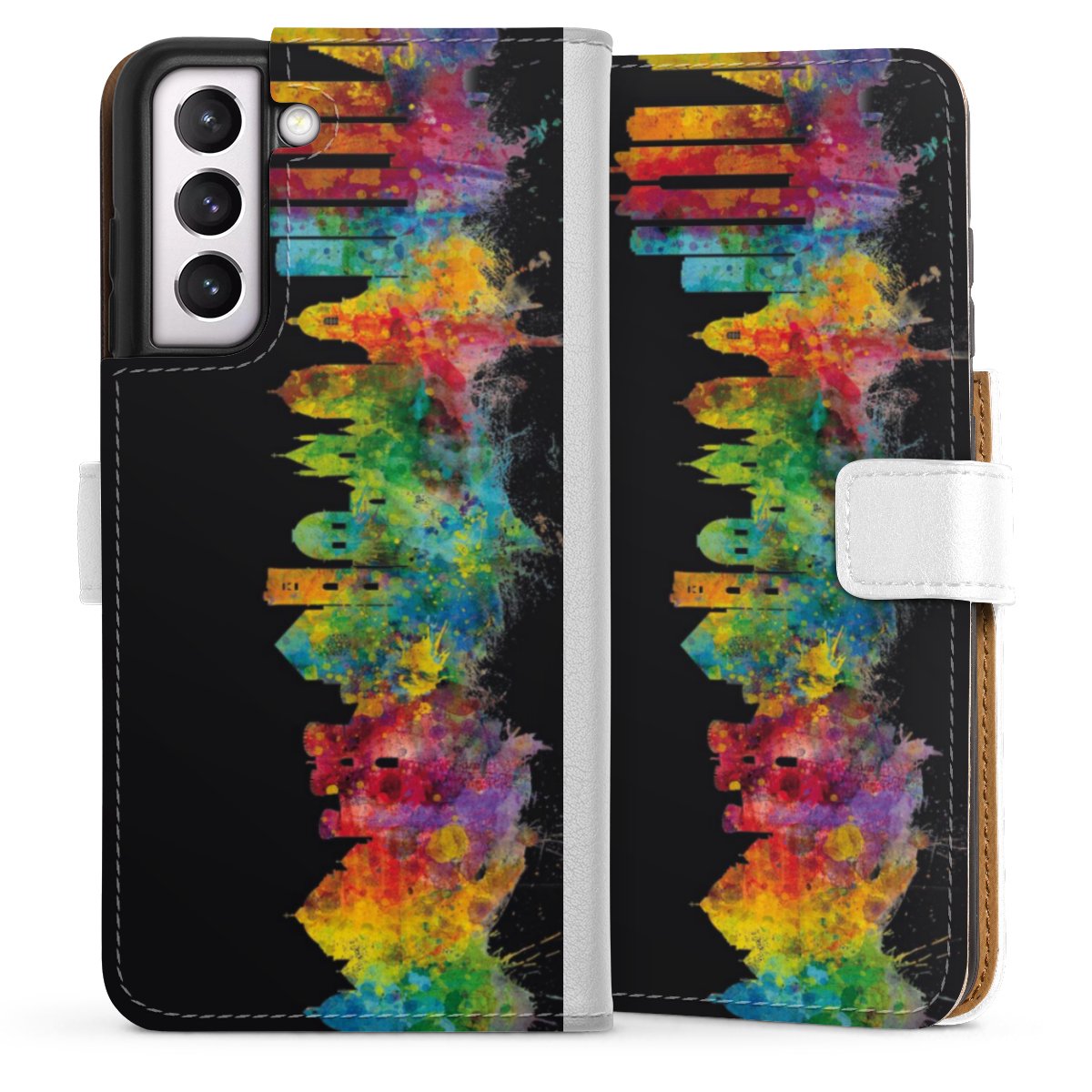 For our Sideflip Case we are using our advanced direct printing technology. The back and frontside are fully printabale, the inside of the phone bag is left unprinted. You can order the phone case without print, printed completely or also with a partial print.