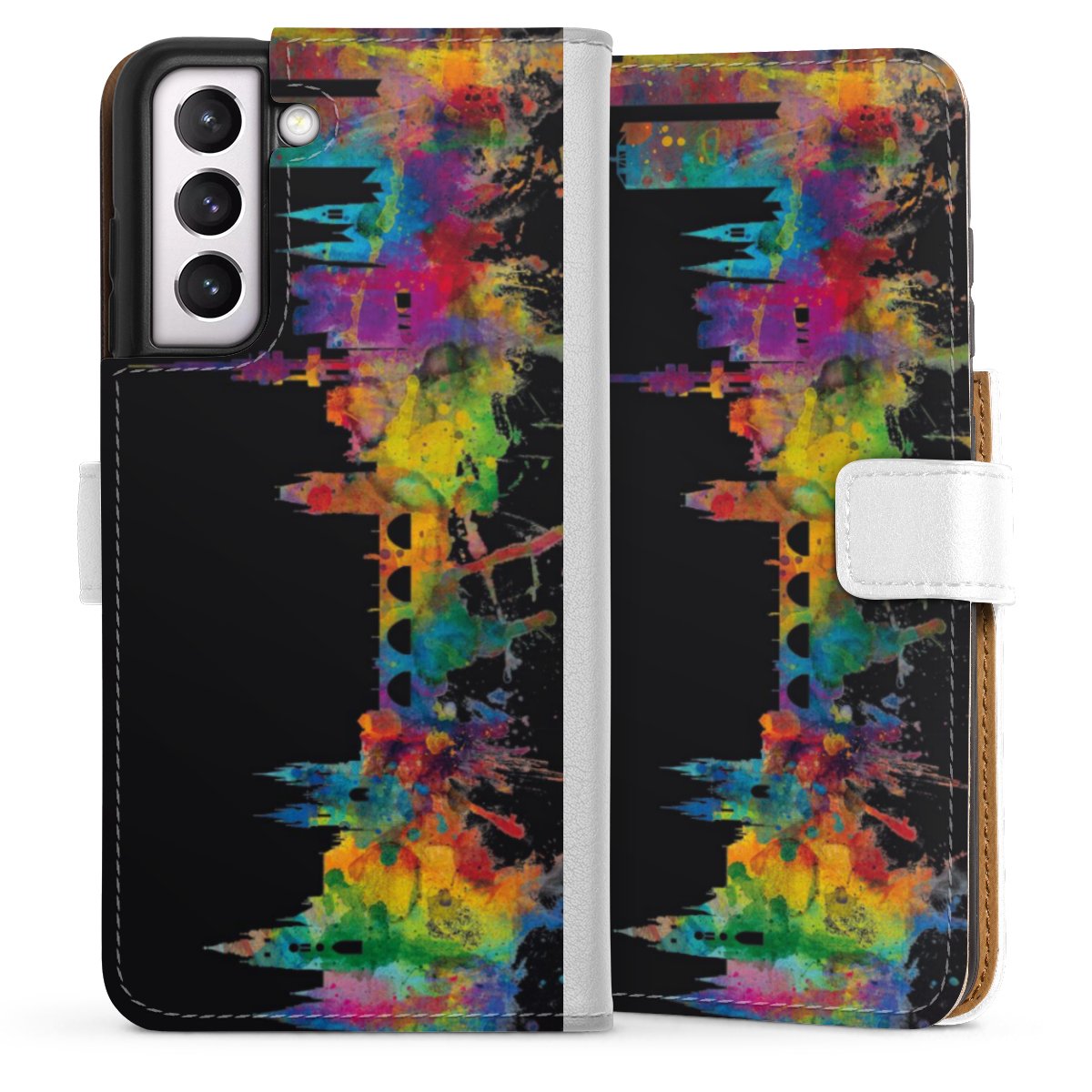 For our Sideflip Case we are using our advanced direct printing technology. The back and frontside are fully printabale, the inside of the phone bag is left unprinted. You can order the phone case without print, printed completely or also with a partial print.