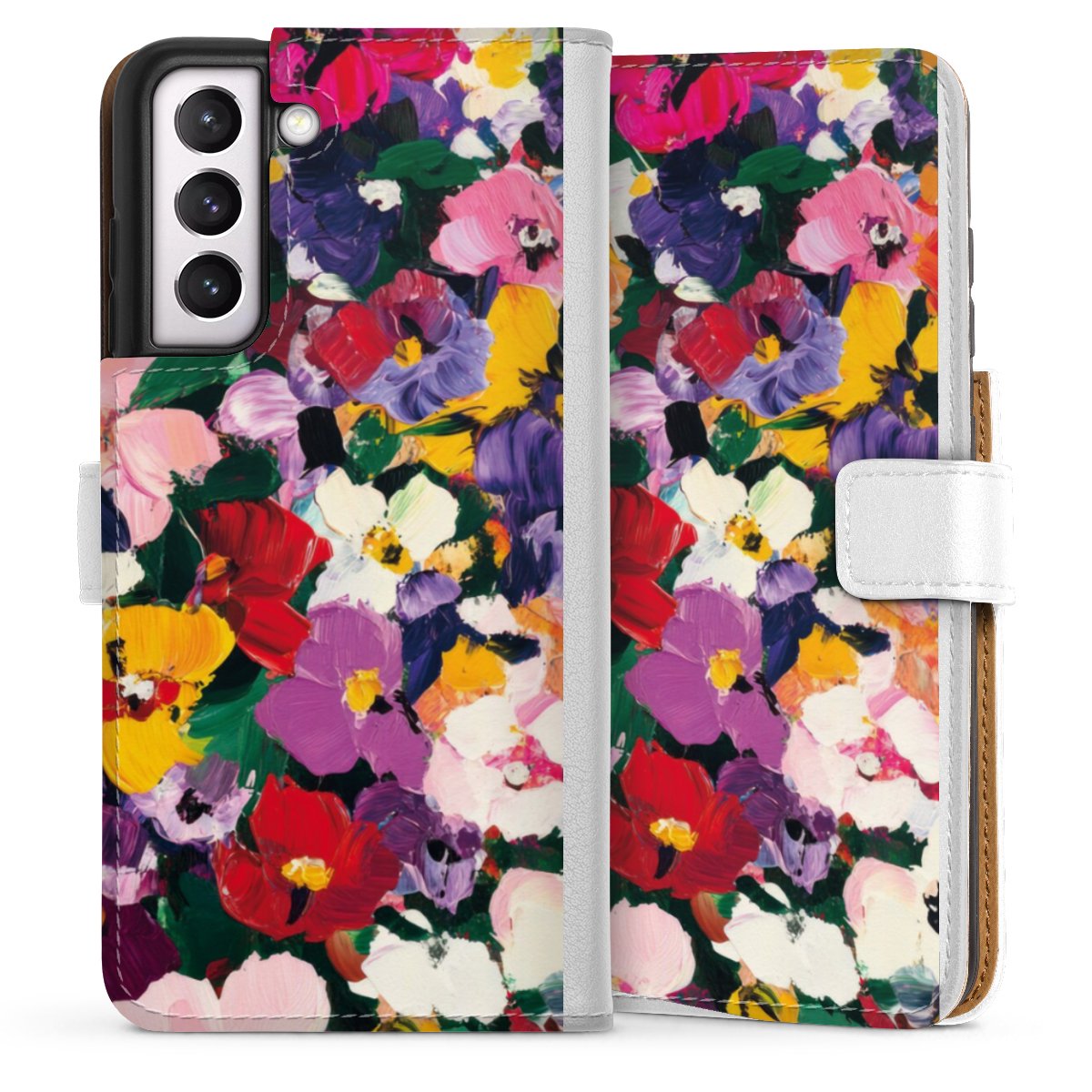 For our Sideflip Case we are using our advanced direct printing technology. The back and frontside are fully printabale, the inside of the phone bag is left unprinted. You can order the phone case without print, printed completely or also with a partial print.