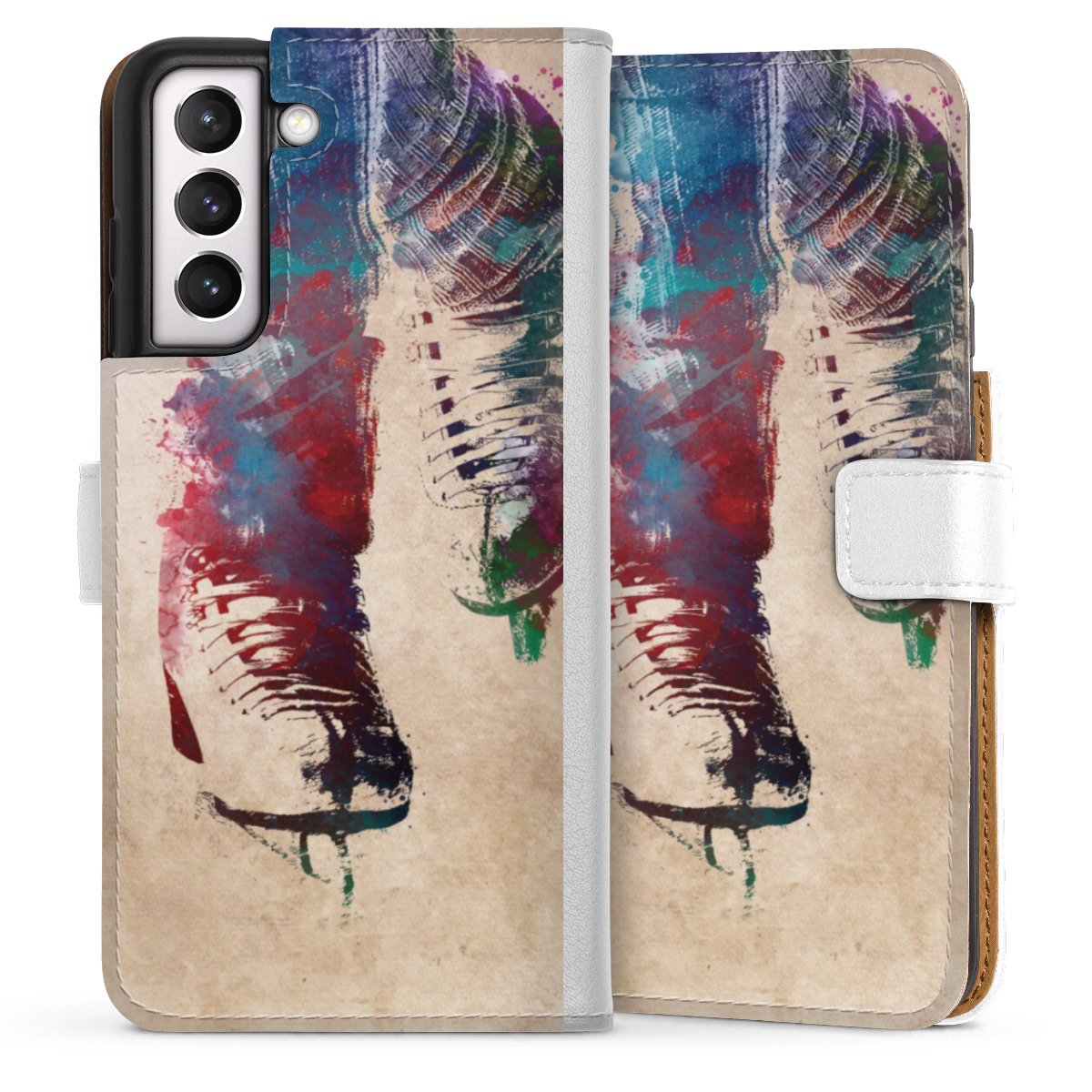 For our Sideflip Case we are using our advanced direct printing technology. The back and frontside are fully printabale, the inside of the phone bag is left unprinted. You can order the phone case without print, printed completely or also with a partial print.