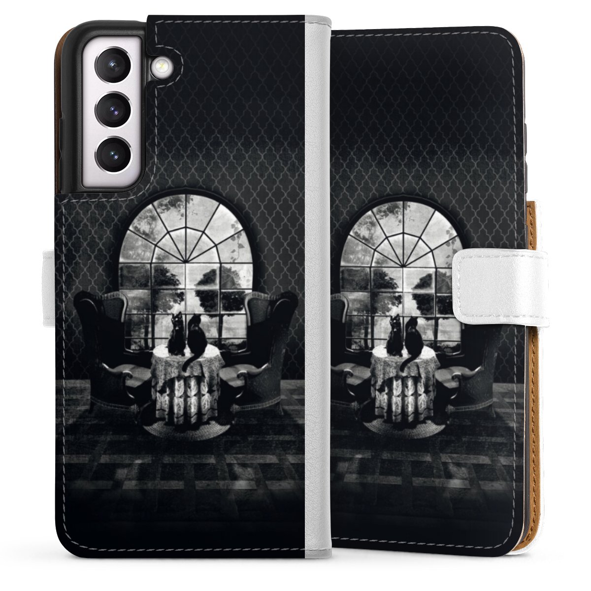 For our Sideflip Case we are using our advanced direct printing technology. The back and frontside are fully printabale, the inside of the phone bag is left unprinted. You can order the phone case without print, printed completely or also with a partial print.