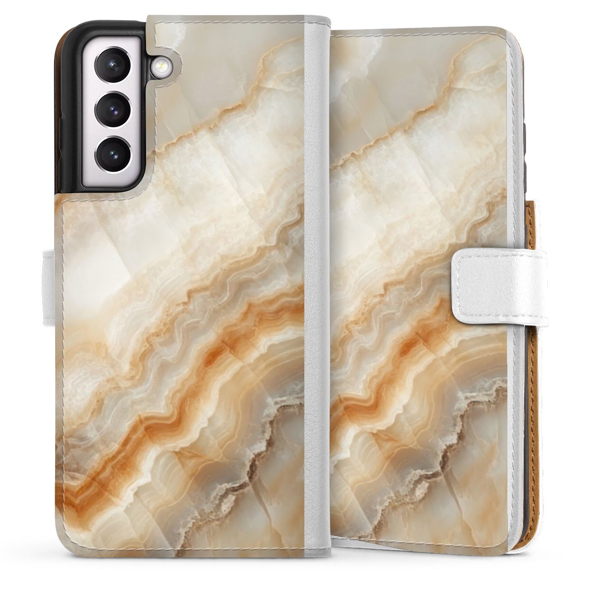 For our Sideflip Case we are using our advanced direct printing technology. The back and frontside are fully printabale, the inside of the phone bag is left unprinted. You can order the phone case without print, printed completely or also with a partial print.