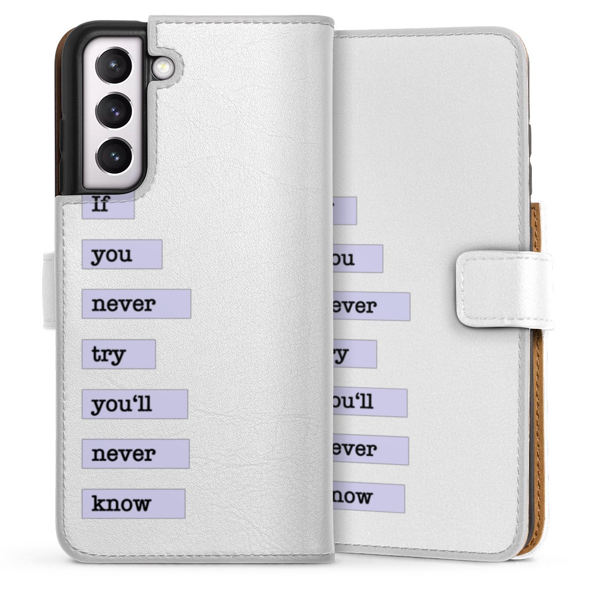 For our Sideflip Case we are using our advanced direct printing technology. The back and frontside are fully printabale, the inside of the phone bag is left unprinted. You can order the phone case without print, printed completely or also with a partial print.
