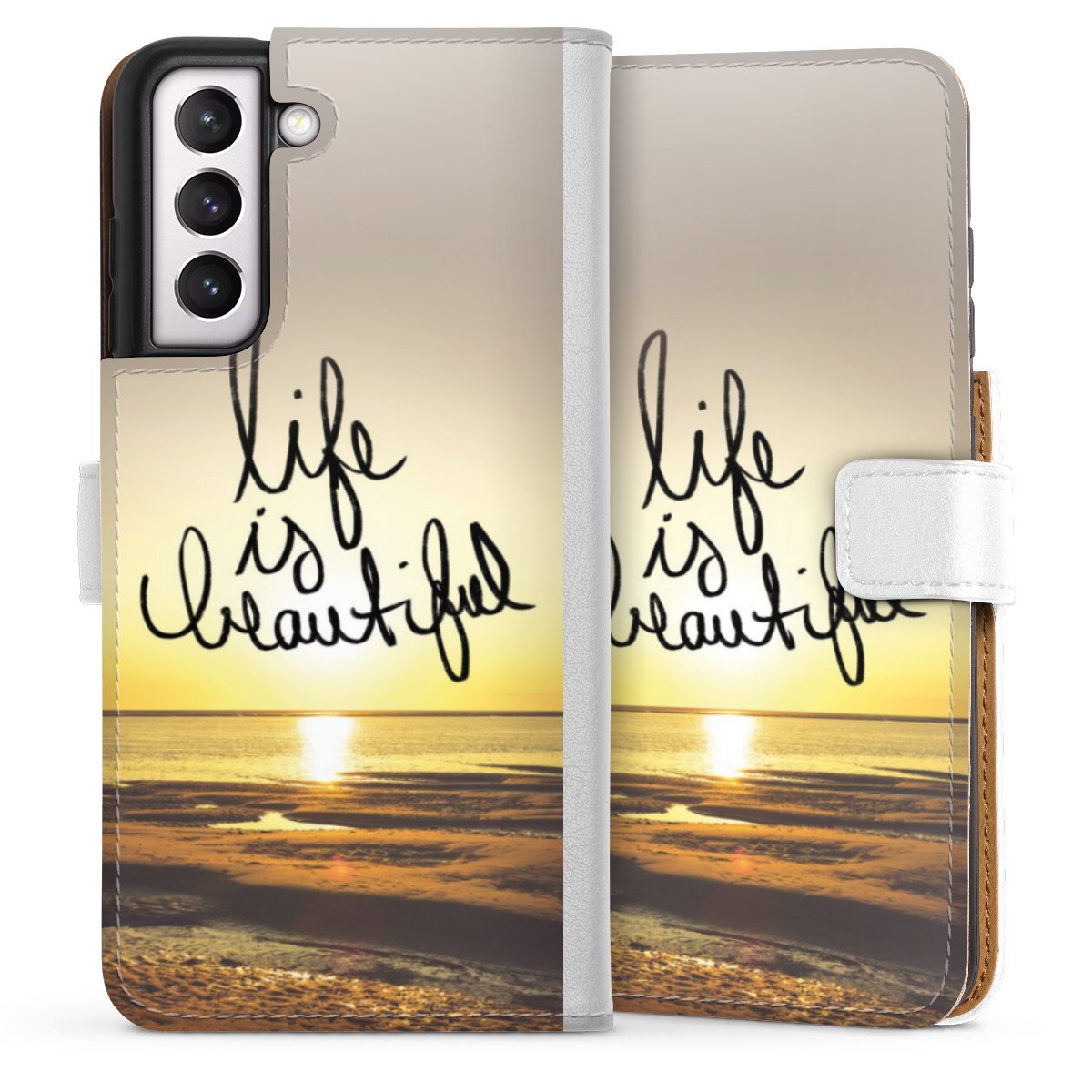 For our Sideflip Case we are using our advanced direct printing technology. The back and frontside are fully printabale, the inside of the phone bag is left unprinted. You can order the phone case without print, printed completely or also with a partial print.