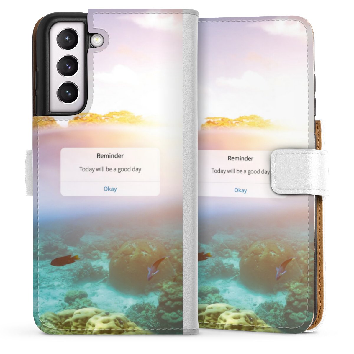 For our Sideflip Case we are using our advanced direct printing technology. The back and frontside are fully printabale, the inside of the phone bag is left unprinted. You can order the phone case without print, printed completely or also with a partial print.