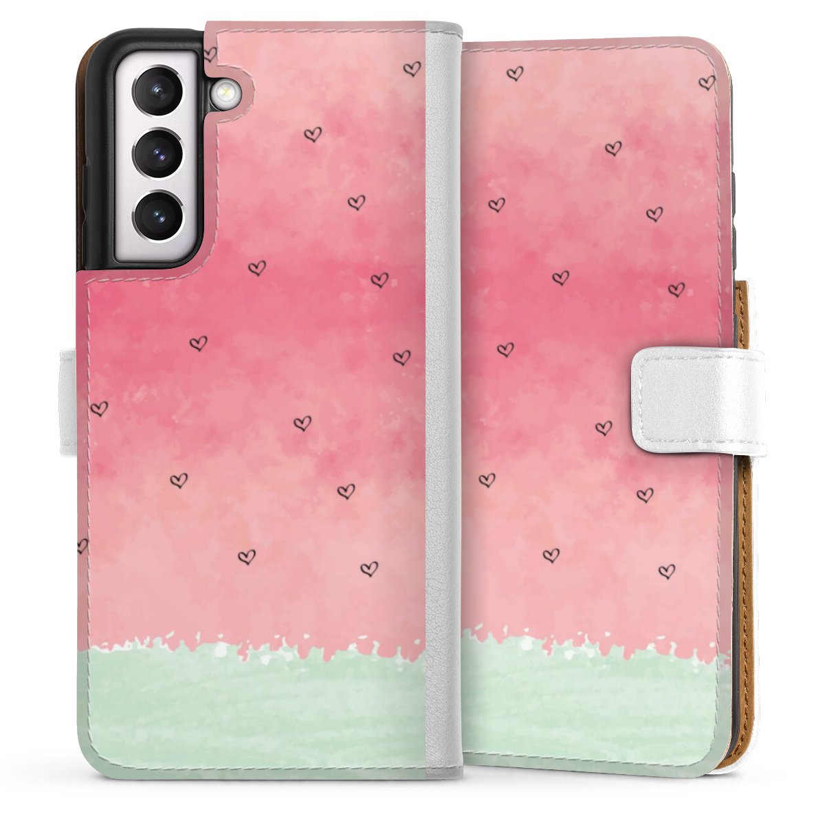 For our Sideflip Case we are using our advanced direct printing technology. The back and frontside are fully printabale, the inside of the phone bag is left unprinted. You can order the phone case without print, printed completely or also with a partial print.