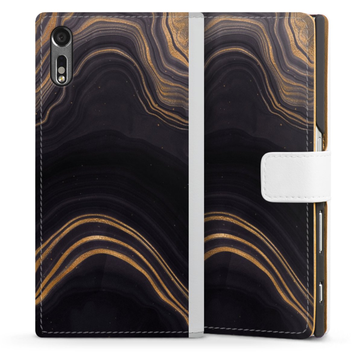 For our Sideflip Case we are using our advanced direct printing technology. The back and frontside are fully printabale, the inside of the phone bag is left unprinted. You can order the phone case without print, printed completely or also with a partial print.