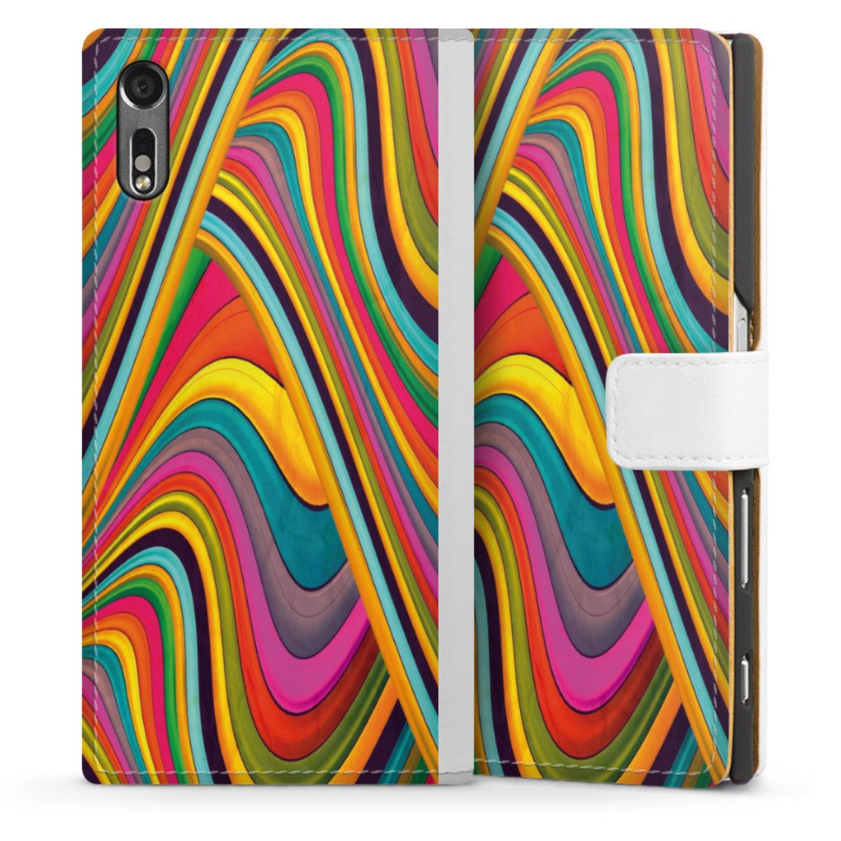 For our Sideflip Case we are using our advanced direct printing technology. The back and frontside are fully printabale, the inside of the phone bag is left unprinted. You can order the phone case without print, printed completely or also with a partial print.