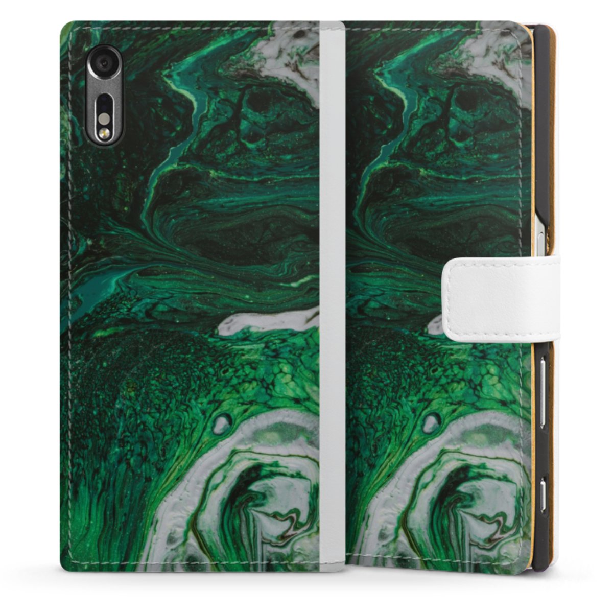 For our Sideflip Case we are using our advanced direct printing technology. The back and frontside are fully printabale, the inside of the phone bag is left unprinted. You can order the phone case without print, printed completely or also with a partial print.