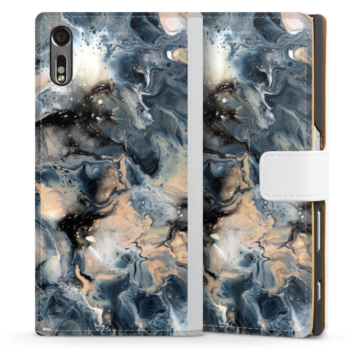 For our Sideflip Case we are using our advanced direct printing technology. The back and frontside are fully printabale, the inside of the phone bag is left unprinted. You can order the phone case without print, printed completely or also with a partial print.