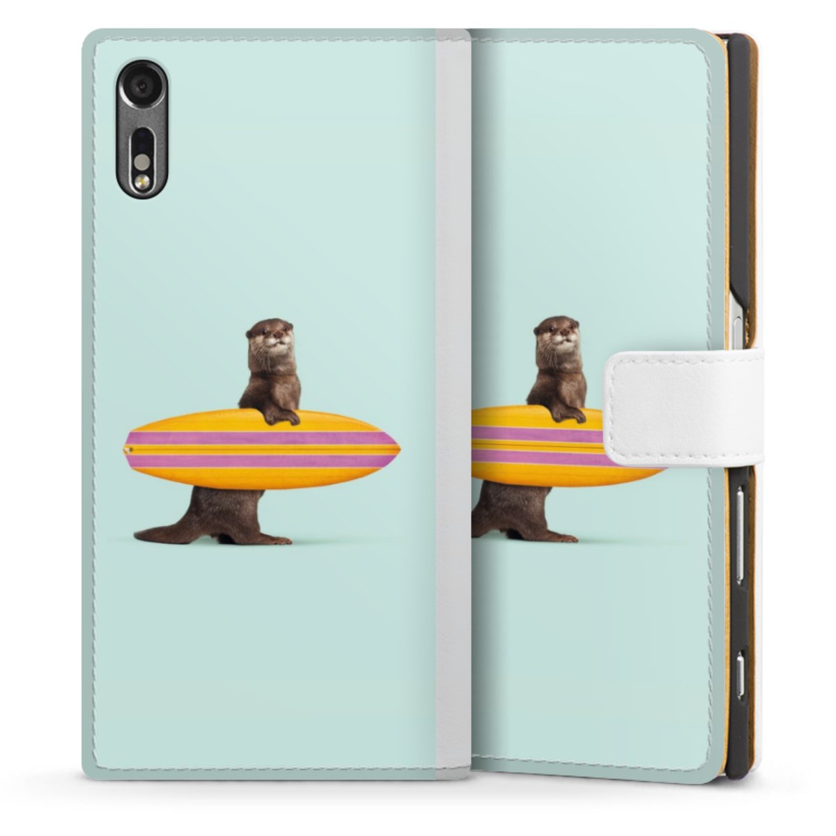 For our Sideflip Case we are using our advanced direct printing technology. The back and frontside are fully printabale, the inside of the phone bag is left unprinted. You can order the phone case without print, printed completely or also with a partial print.