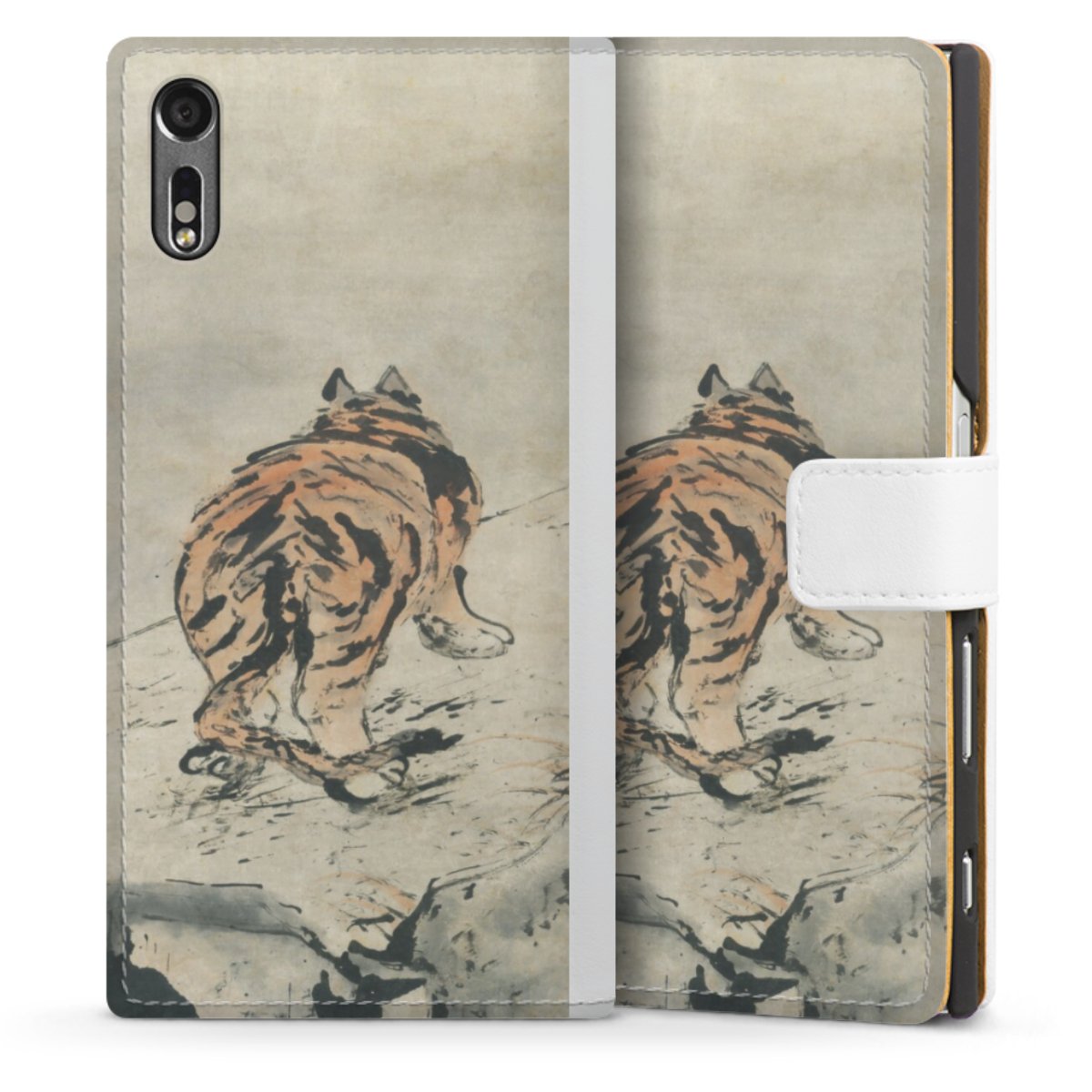 For our Sideflip Case we are using our advanced direct printing technology. The back and frontside are fully printabale, the inside of the phone bag is left unprinted. You can order the phone case without print, printed completely or also with a partial print.