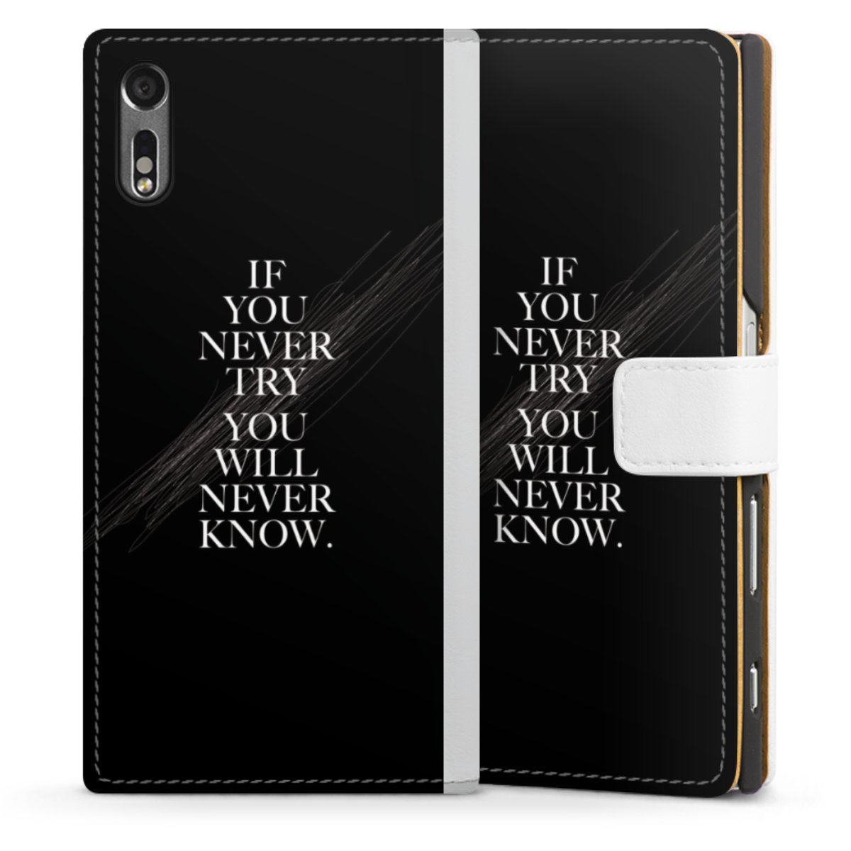 For our Sideflip Case we are using our advanced direct printing technology. The back and frontside are fully printabale, the inside of the phone bag is left unprinted. You can order the phone case without print, printed completely or also with a partial print.