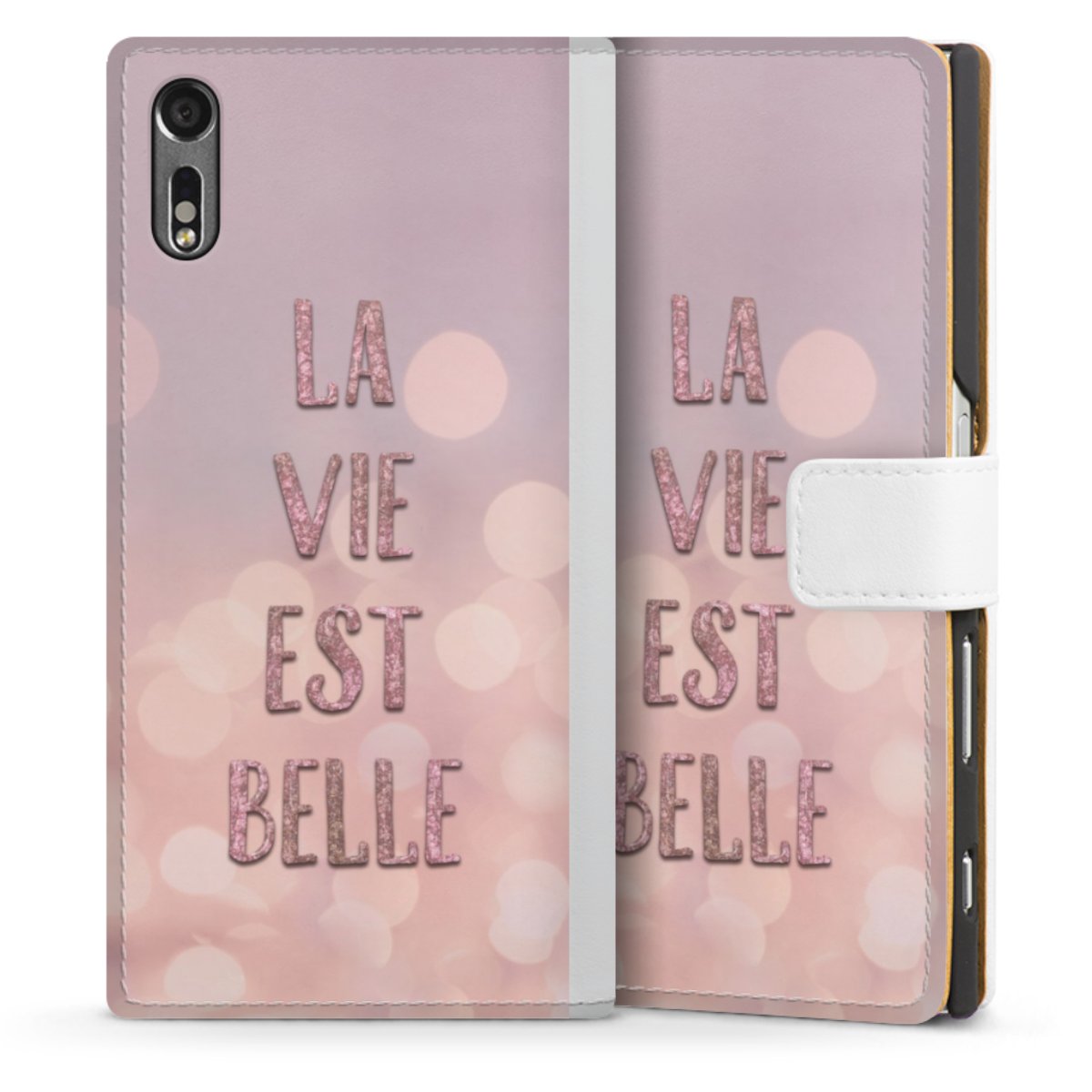 For our Sideflip Case we are using our advanced direct printing technology. The back and frontside are fully printabale, the inside of the phone bag is left unprinted. You can order the phone case without print, printed completely or also with a partial print.