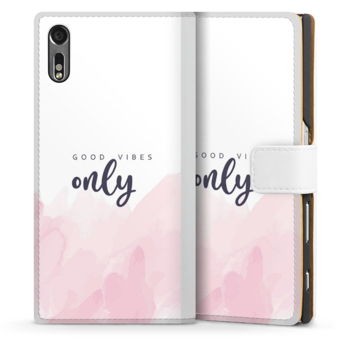 For our Sideflip Case we are using our advanced direct printing technology. The back and frontside are fully printabale, the inside of the phone bag is left unprinted. You can order the phone case without print, printed completely or also with a partial print.