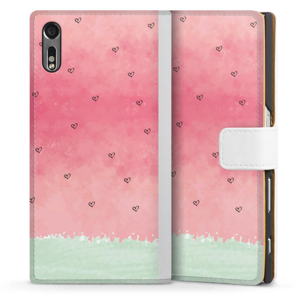 For our Sideflip Case we are using our advanced direct printing technology. The back and frontside are fully printabale, the inside of the phone bag is left unprinted. You can order the phone case without print, printed completely or also with a partial print.
