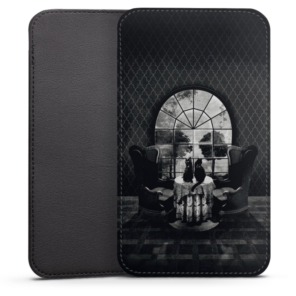 Product details This handy phone sleeve protects your device all around and is made from a highqhality vegan Skai® leather imitate in black on the backside and white on the printable frontside.