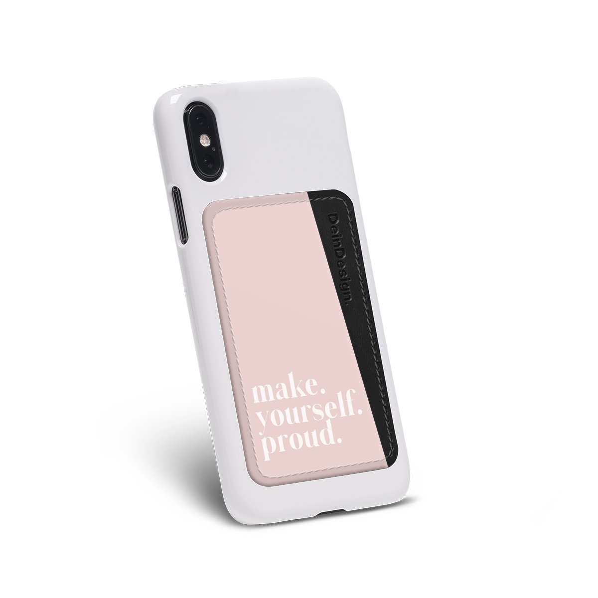 We advise to clean your phone case with a soft cloth and a mild detergent first. On the back of the card holder you will find an adhesive strip. Pull off the protective film and press the card holder firmly against the phone case – that’s it!