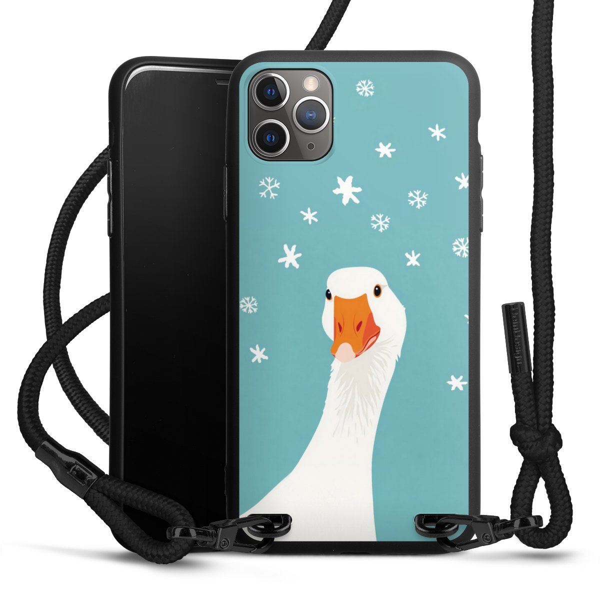 The matt black silicone case is made of flexible TPU (thermoplastic polyurethane) and offers robust protection. The durable, unbreakable material makes the cover flexible and dimensionally stable at the same time. The matte surface makes your design stand out more and is less susceptible to fingerprints and dirt. The stylish trend accessory fits comfortably in the hand and is perfectly complemented by the fabric (polyester) mobile phone strap. The braided fabric strap is approx. 1.70 metres long with a diameter of approx. 0.5 cm. Due to the special knotting technique, the length of the strap can be adjusted by simply pulling it, so that you can adapt it individually to your wishes. The practical case to wear around your neck is available with the fabric strap in black. As a little icing on the cake, we have provided the strap with a chic metal fastener in matt black. The strap is securely fastened to the case with loops made of high-quality genuine leather and press studs. The ends of the fabric strap are covered with metallic end caps and thus protected from fraying.